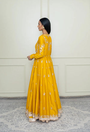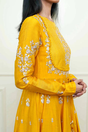 This ensemble features our signature Kashmiri Tilla embroidery. The elegant drape is accompanied with a zero neck with chooridaar sleeves. The ankle-length anarkali is teamed up with a crushed skirt. The yoke is highlighted with very fine pintucks and the embroidery is highlighted with very fine ivory pearls. The technique is an age-old tradition & one shall cherished it forever. The outfit is finished using a contrasting chanderi silk banarsi fabric and gota.