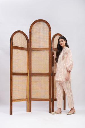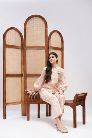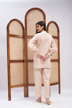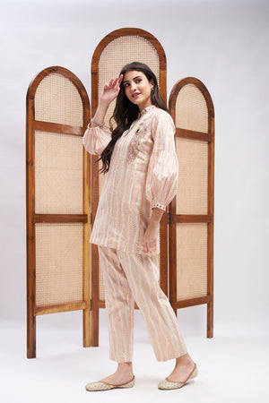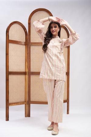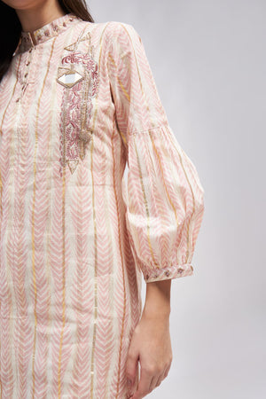 Pink Kurta set with embroidery detailing and matching pants. The combination of embroidery with easy ethnic wear, mandarin collar, and bishop sleeves makes this ensemble stand out, offering a distinct and fashionable look. Our pants are impeccably tailored for a sleek and flattering appearance, allowing you to look effortlessly chic and sophisticated.