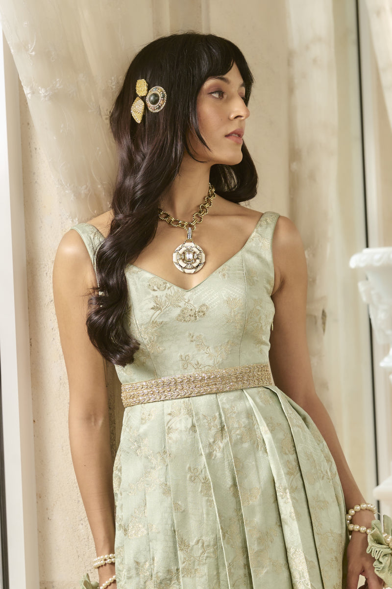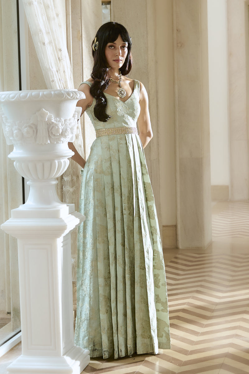 A turquoise blue strapped gown crafted in luxurious silver jacquard. The silhouette features a finely pleated lower half that adds graceful movement, while the waist is cinched with a hand-embroidered zardozi belt—adding a touch of ornate elegance to the contemporary form