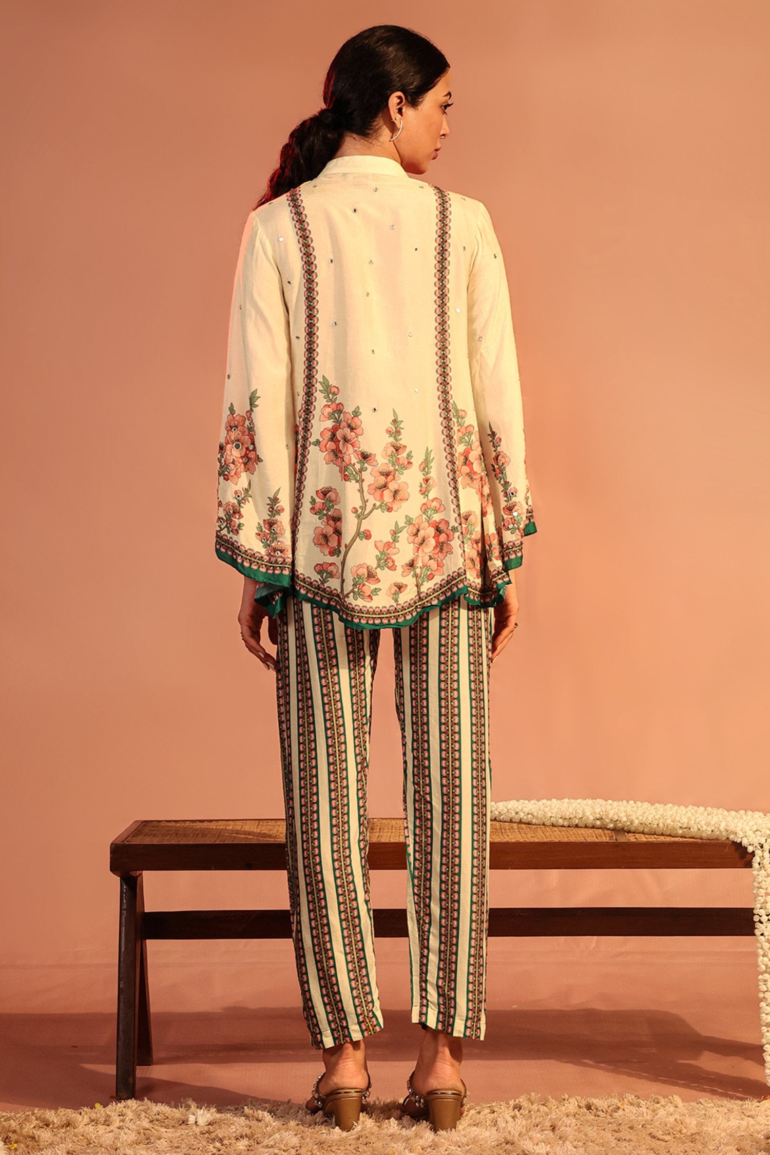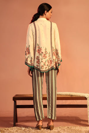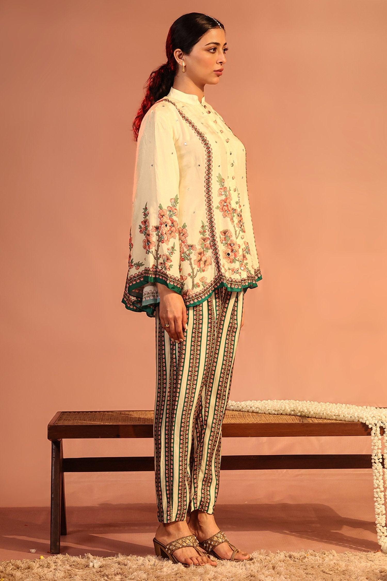 Multicolor Tamaya embroidered paneled top with flared sleeves, paired with pants in Malaysian silk.