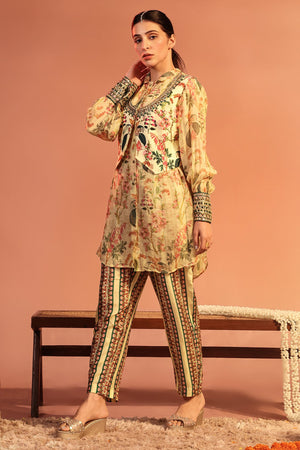Cream Tamaya printed sheer shirt kurta and pants, paired with an embroidered jacket in Malaysian silk.