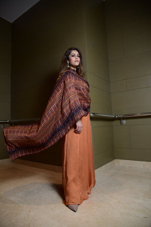 Featuring A Two Piece Sleeveless,Under-Wire Padded Bustier Anarkali In Tangarine Color Paired With A Printed Detachable Draped Dupatta With A Closed- Collar In The Pallu.
