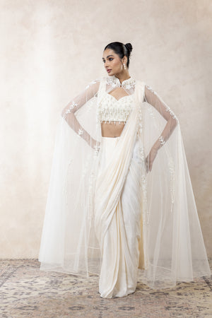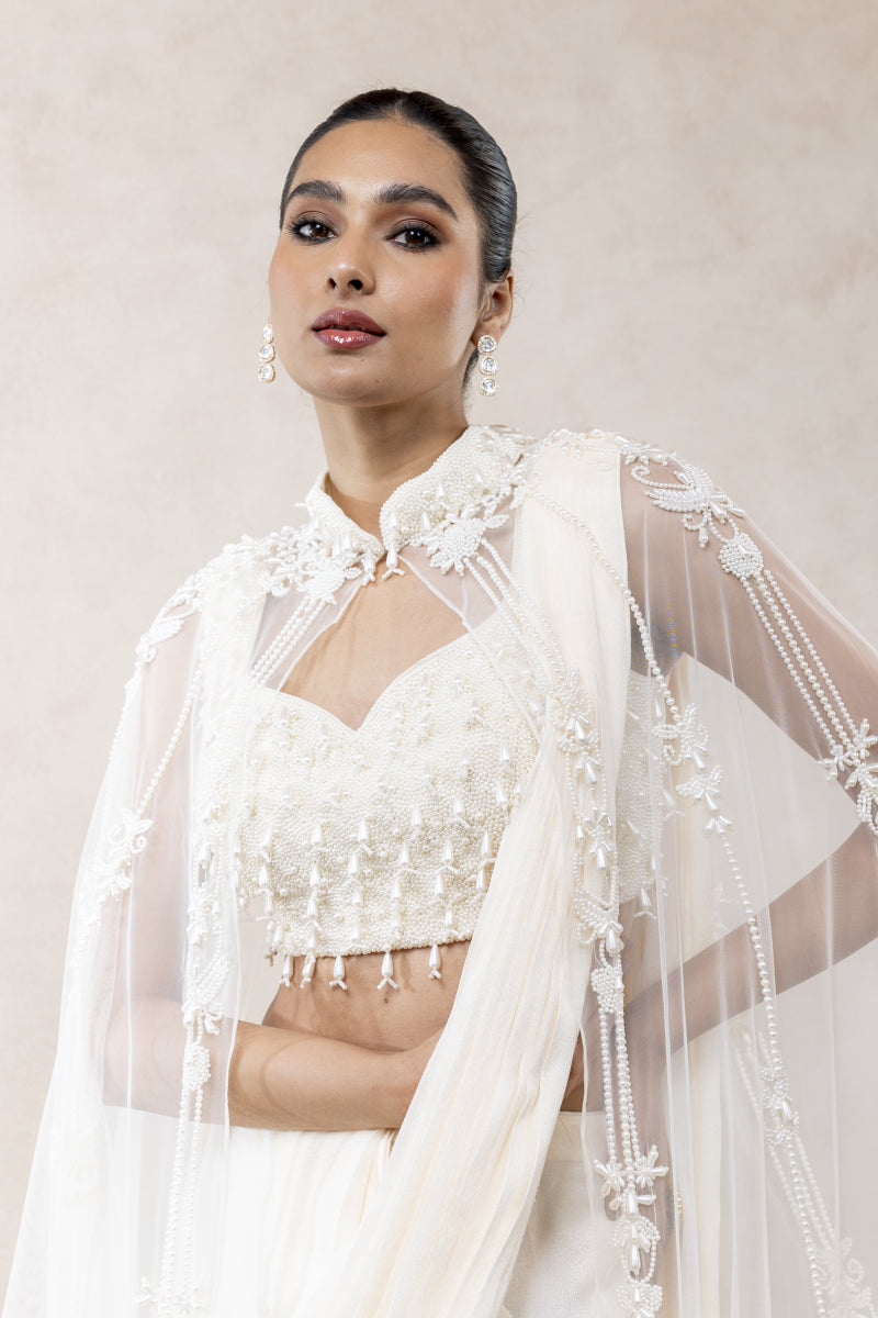Grace meets grandeur in this ivory cape saree, paired with a hand-embroidered blouse and a flowing cape adorned with varied pearlwork. A modern silhouette enriched with timeless detailing — perfect for making an ethereal statement.