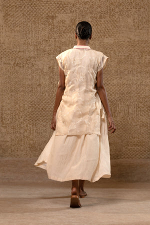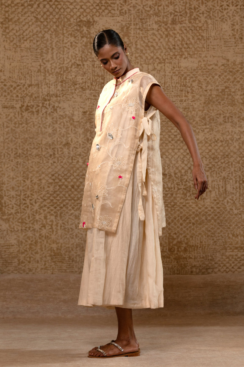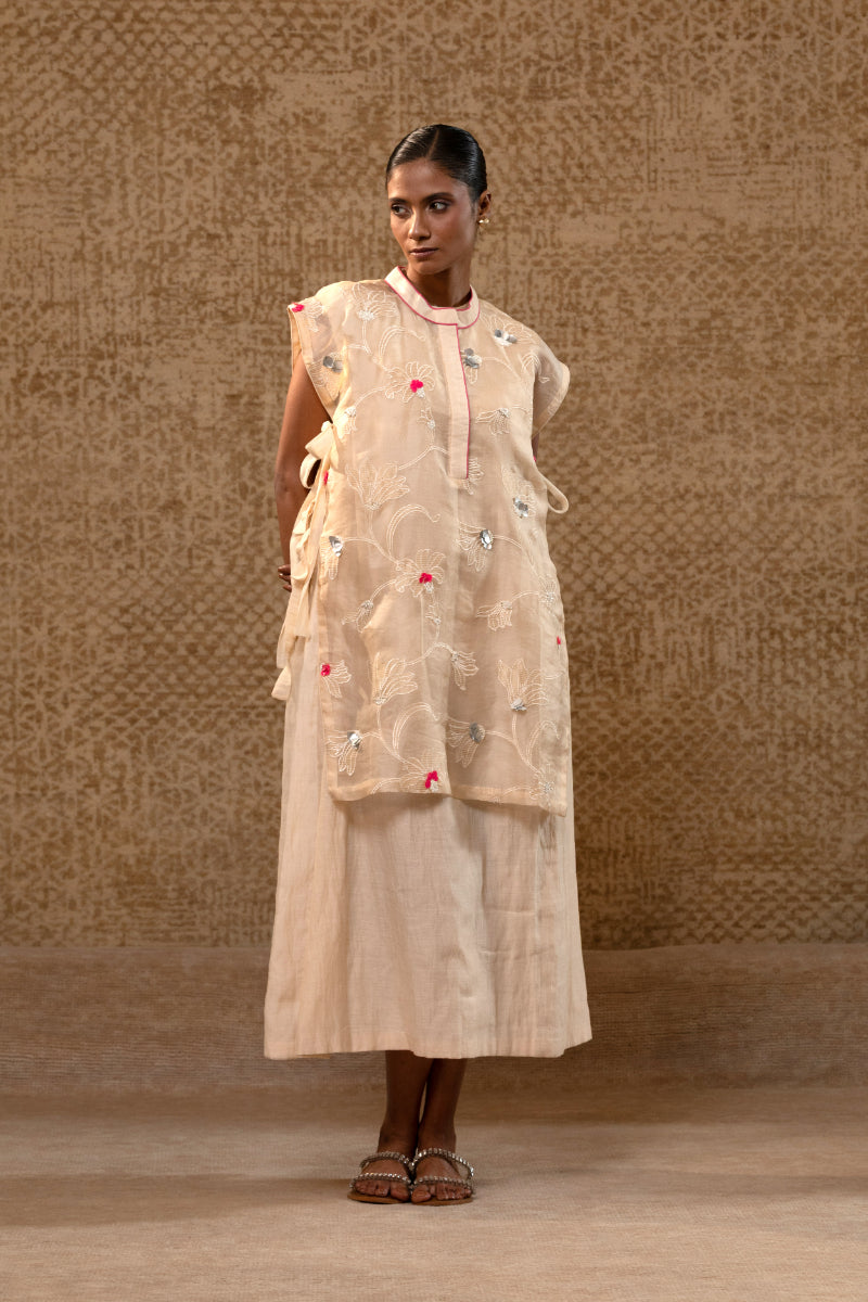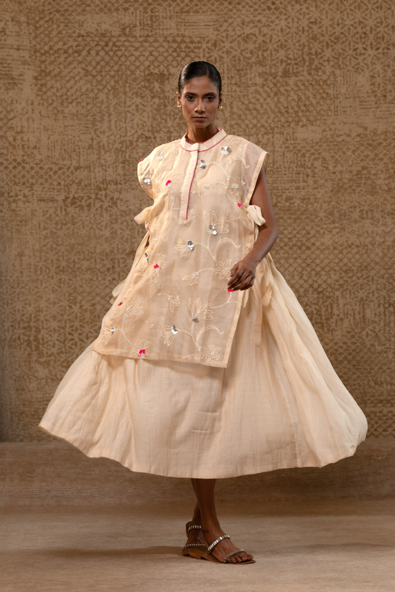 A two-piece set featuring a voluminous base dress layered with an embellished organza overlay. The overlay is appliquéd with zari-woven Chanderi fabric and delicately adorned with scattered sequins — capturing movement, light, and craftsmanship in every fold.