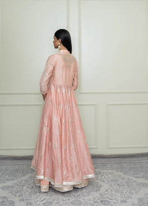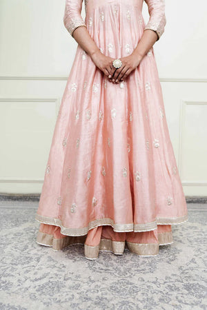 The Taveshi ensemble is features our signature Kashmiri Tilla embroidery. The elegant drape is accompanied by a zero neck with churidar sleeves. The ankle-length anarkali is teamed up with a crushed skirt. The yoke is highlighted with very fine pintucks. The embroidery is highlighted with very fine ivory pearls & the technique is an age-old tradition & one shall cherished it forever. The outfit is finished using a contrasting chanderi silk banarsi fabric and gota.