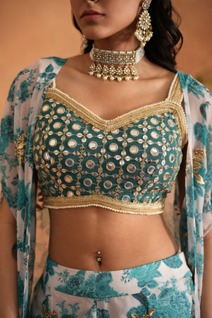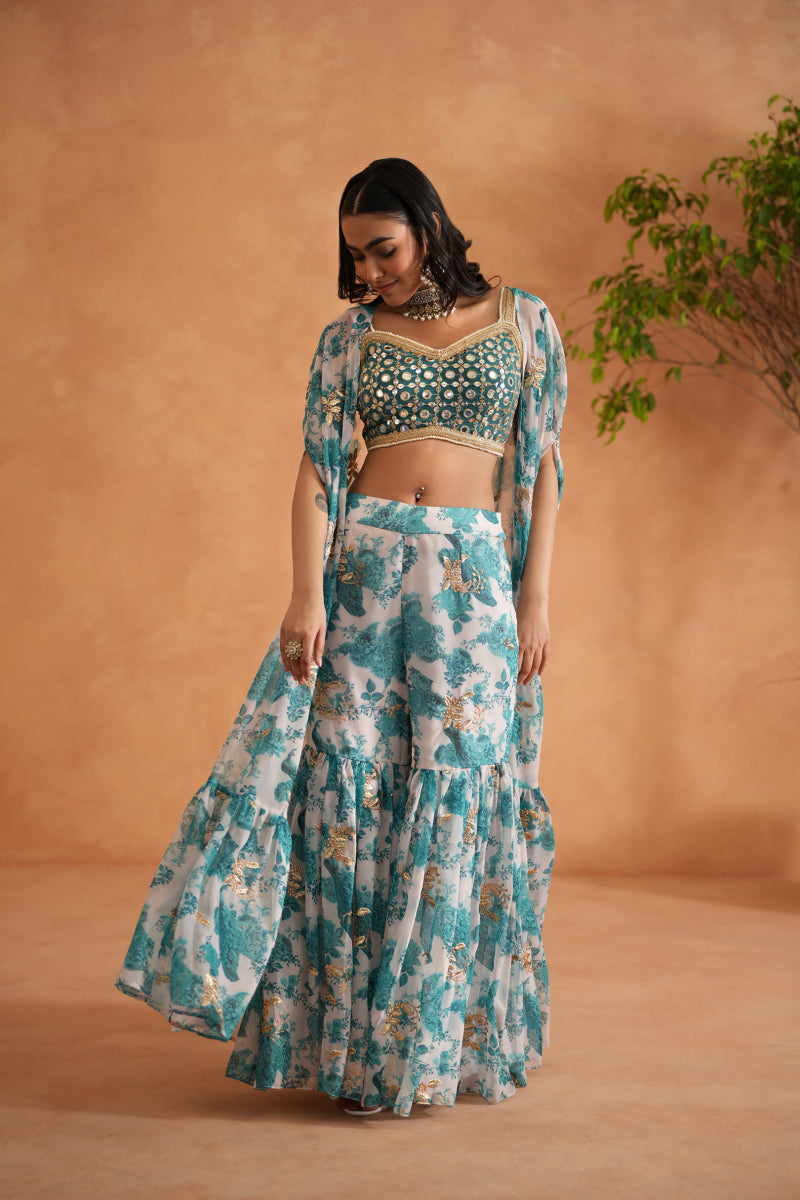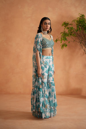 Teal Blue Mirror Blouse, Printed Garara And Cape