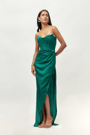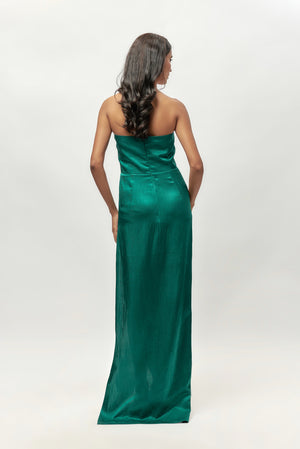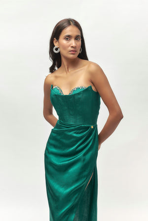 The Teal Green Embellished Gown in Mashroo is a mesmerizing blend of tradition and glamour. The gown's flowing silhouette offers both elegance and movement, making it perfect for a grand evening event. With its refined design and intricate details, this gown promises to make a statement with every step.