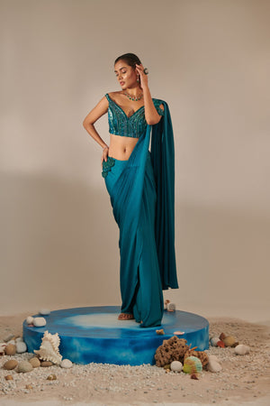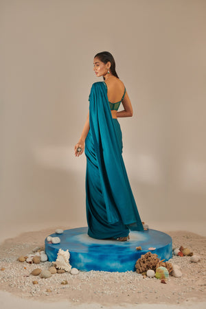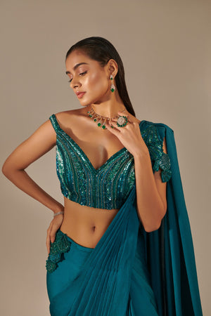 Teal Off Shoulder Pre-Stitch Drape Saree Set