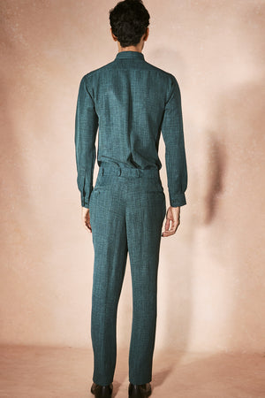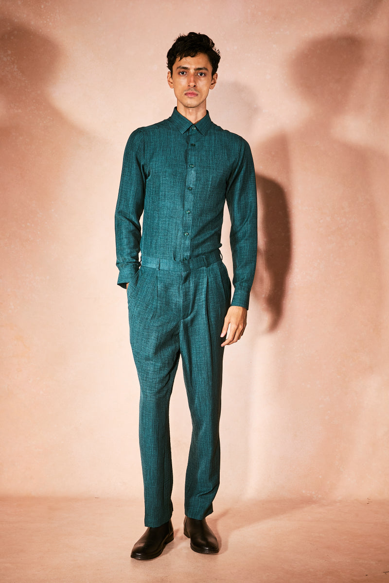 A refined coordinated set in vibrant teal, featuring a sharply tailored full-sleeve shirt paired with straight-leg trousers in matching tones. Bold in color yet precise in structure, this ensemble is polished, elevated, and undeniably fresh, luxury menswear for festive evenings and modern celebrations.