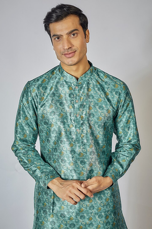 Teal dupion silk based floral printed kurta paired with off white dupion silk based mexican pants.