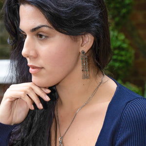 Textured motif pendant necklace with coloured zircons. It is unique, stylish, statement and yet super versatile. Handcrafted on 92.5 silver coated with an antique finish. It is easy to style for the day or evening look. Perfect for cocktail dresses or casual day dresses even. Wear them with sweater dresses r white shirts too!