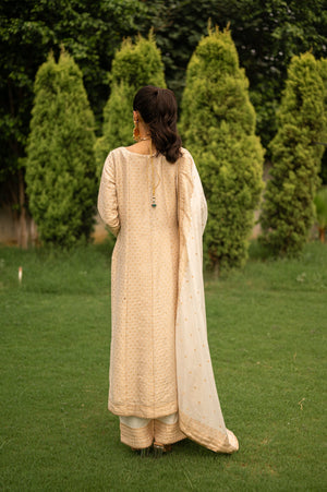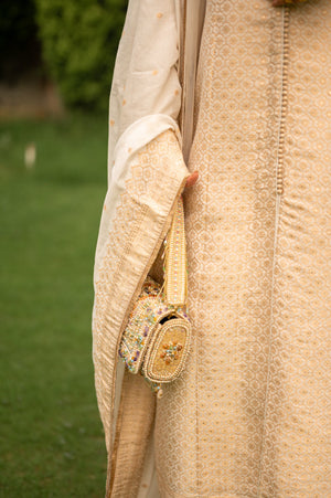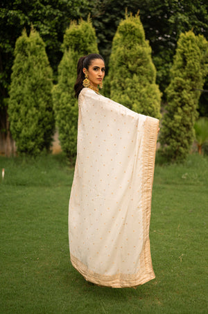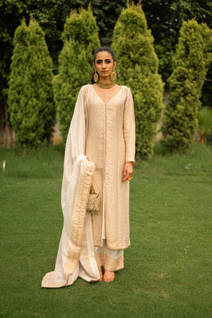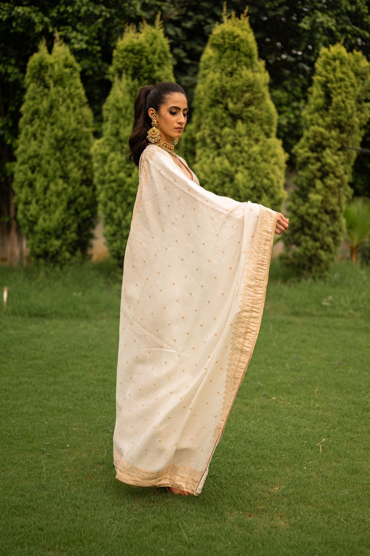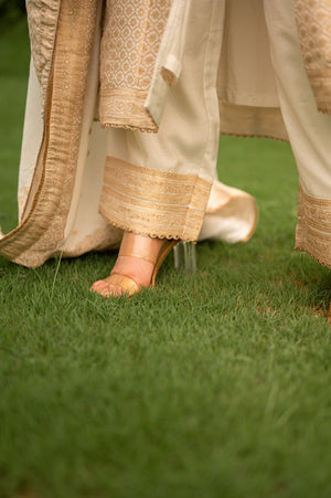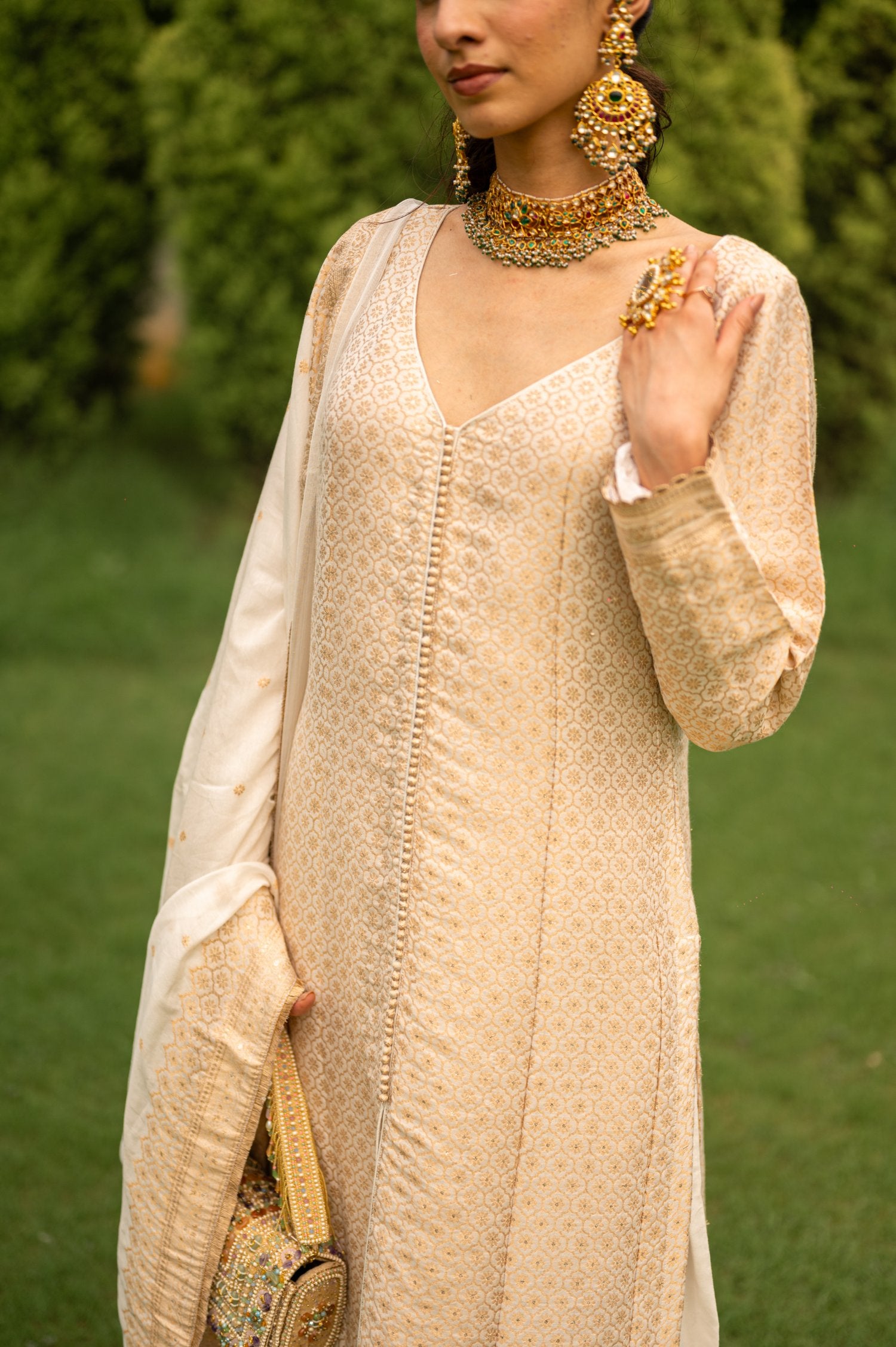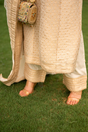 Experience timeless allure in our white kurta set, meticulously tailored from luxurious vegan silk adorned with exquisite rose gold zari work. The front opening cut with potli buttons adds a contemporary twist to the classic design, while the pants and dupatta boasts thick borders, elevating your style with grace and charm. Step into elegance with this enchanting ensemble for any special occasion.