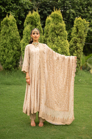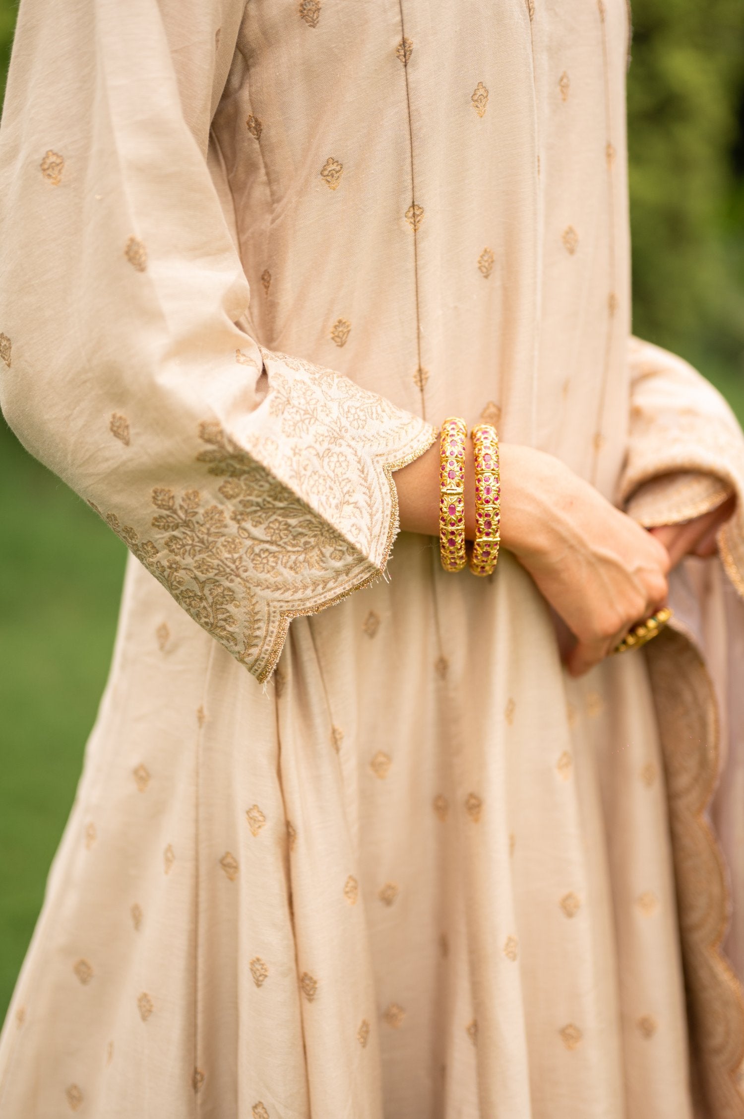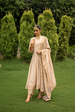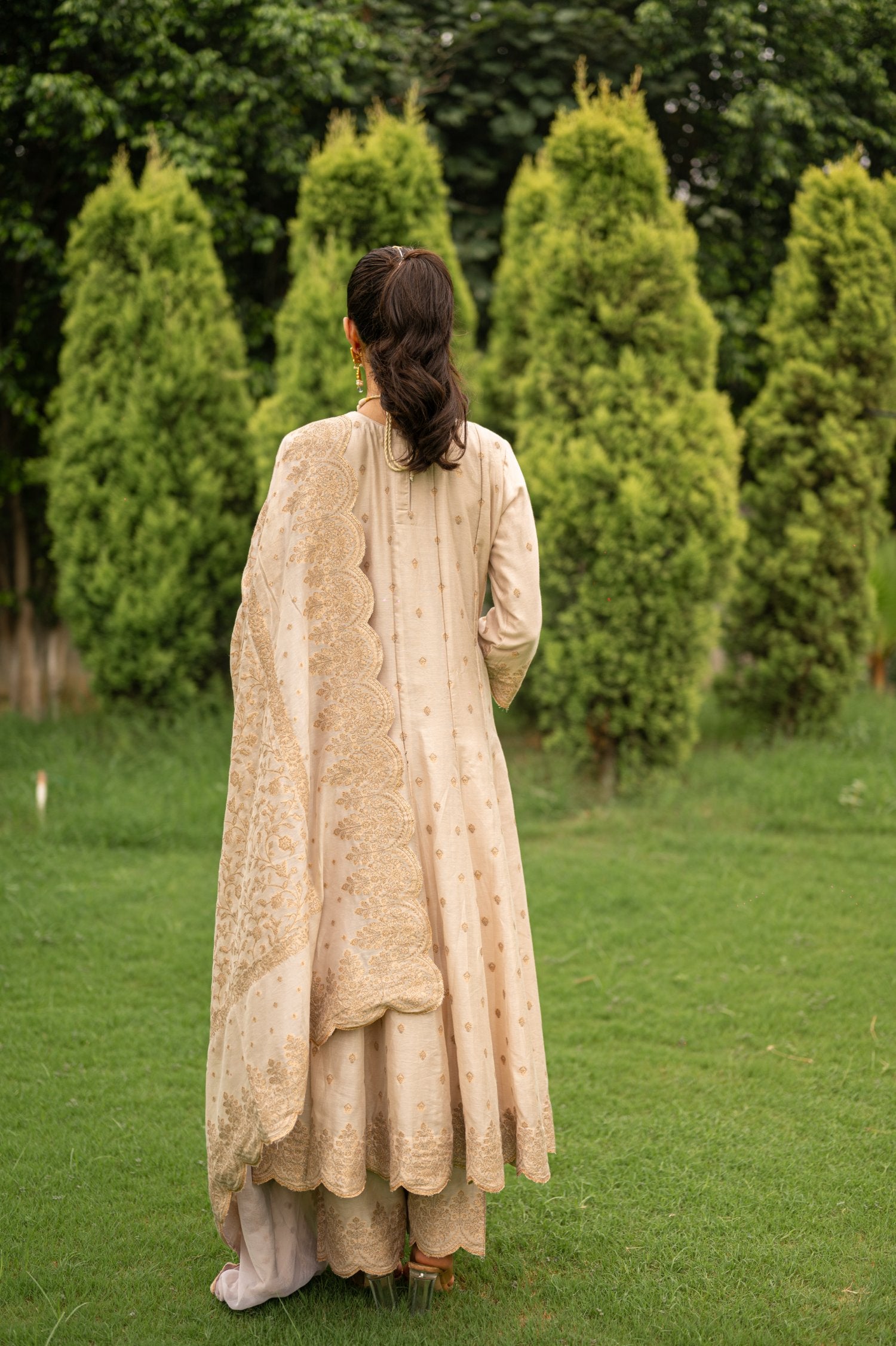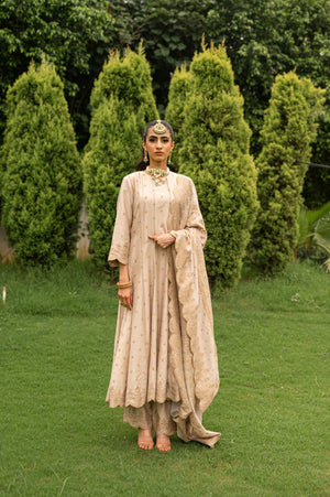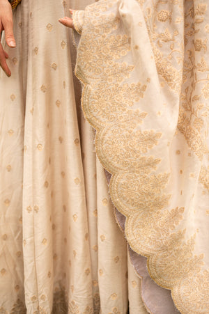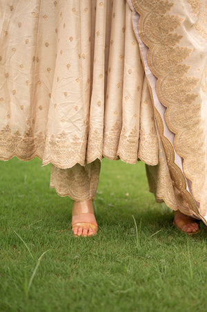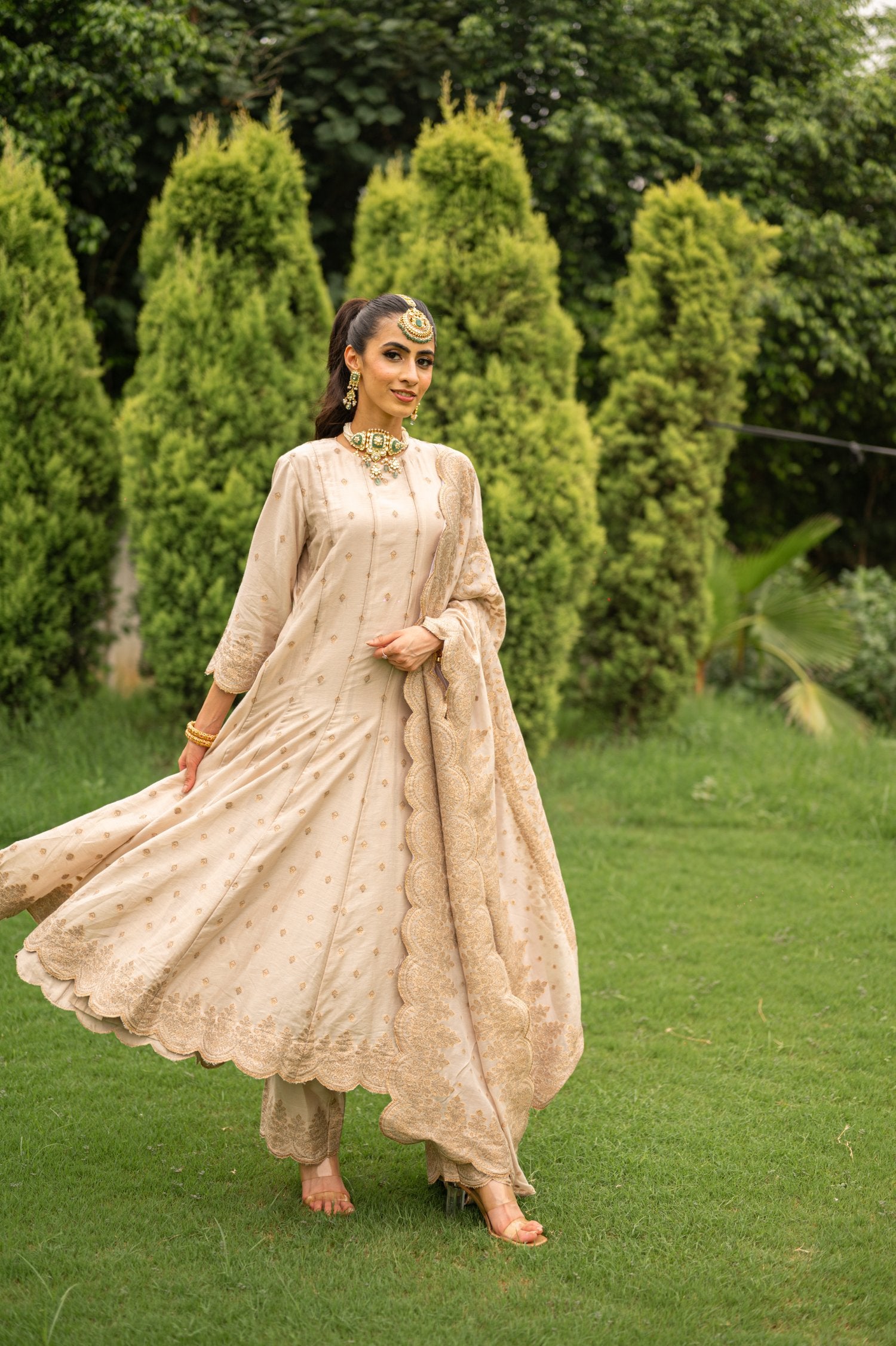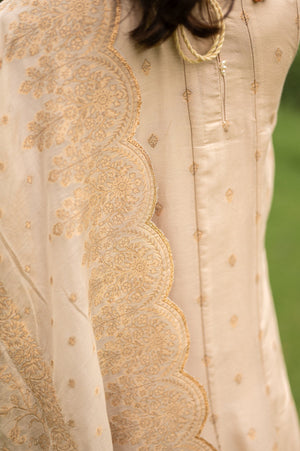 Envelop yourself in elegance with our Ecru/Light Beige Woven Anarkali, tailored to perfection from premium vegan silk and enriched with exquisite zari work. The timeless design features intricate cut work on anarkali, pants and dupatta, adding a touch of allure to this classic ensemble. The Anarkali has a light spread all over and a floral woven border with scalloping on the ghera. The set is paired with matching pants and a dupatta with heavy floral design. Make a lasting impression at weddings and special events with this ethically crafted masterpiece.