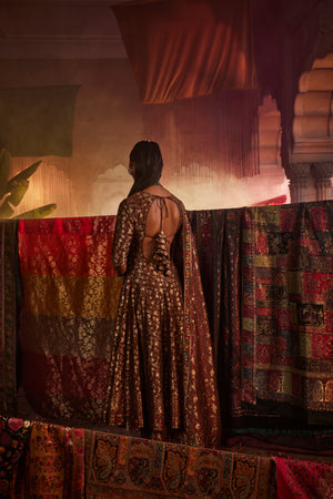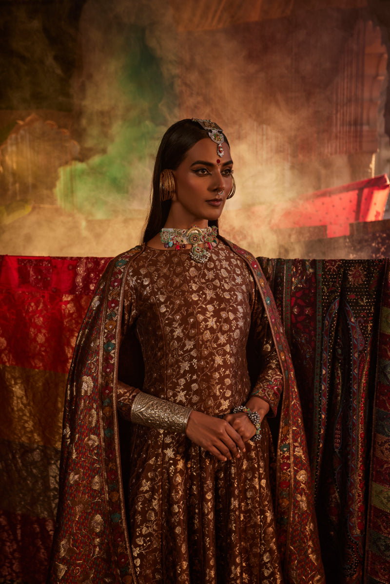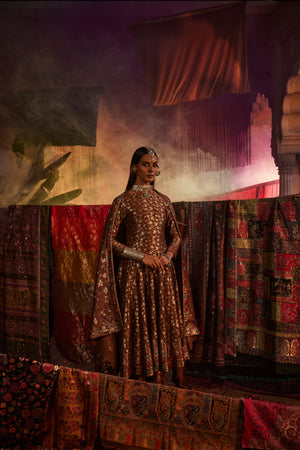 The Begumpur Anarkali is a timeless masterpiece in a deep, luxurious brown gold hues that radiates charm and sophistication. Crafted in an exquisite Banarasi weave, it strikes the perfect balance between elegance and drama. Paired with a beautifully woven multi coloured Phulkari dupatta, this ensemble is a seamless blend of traditional artistry and contemporary grace, making it an impeccable choice for grand occasions.