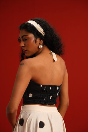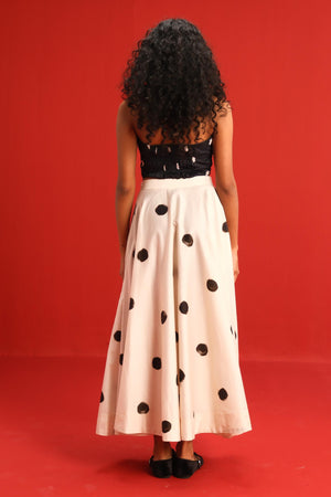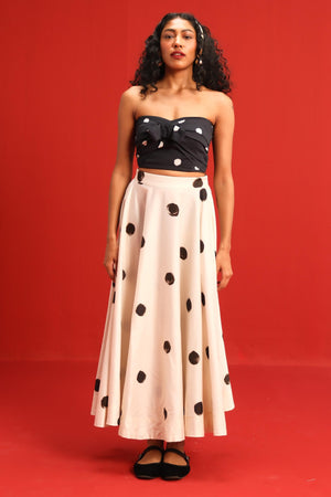 Featuring a strapless knotted bandeau top in black with scattered blush polka dots, paired effortlessly with a high-waisted ivory skirt adorned with oversized contrasting black polka dots, this set balances retro charm with modern silhouette. The soft, flowy fabric ensures a flattering drape and ease of movement, while the mix-and-match polka motif adds a youthful flair to your wardrobe.