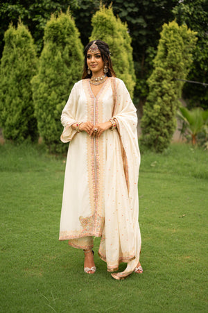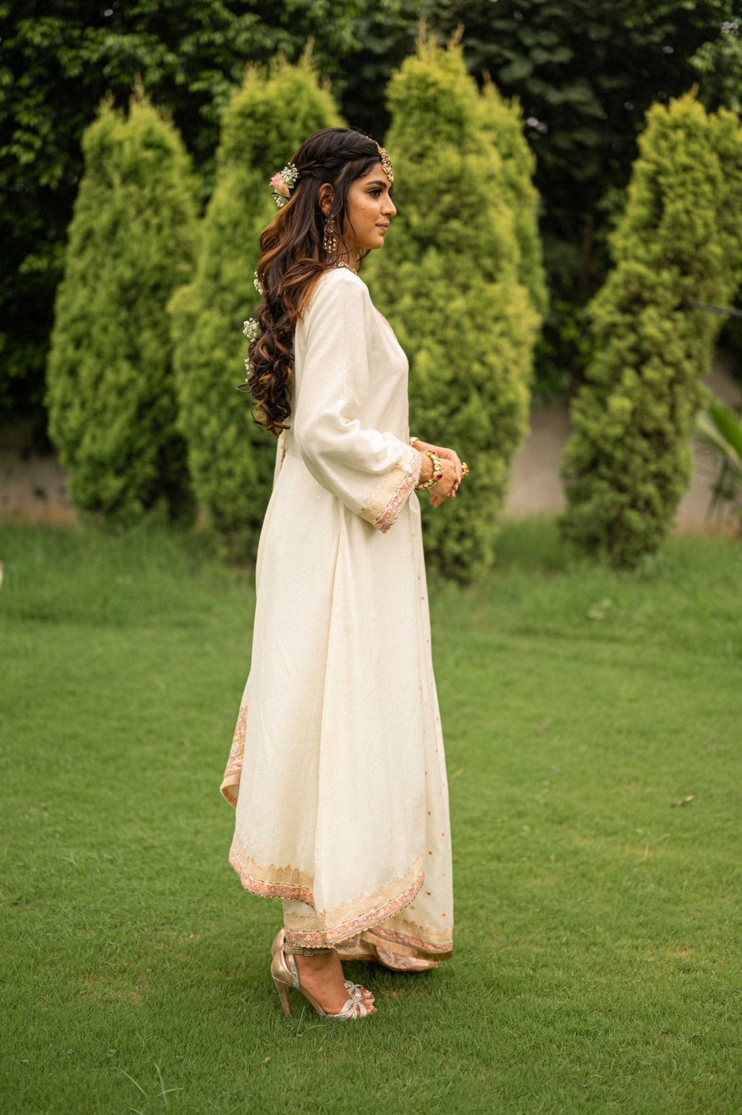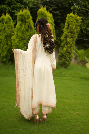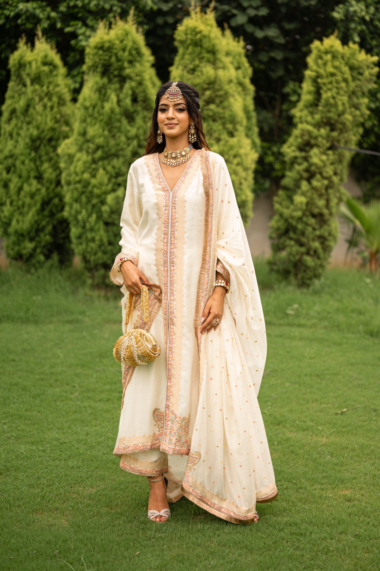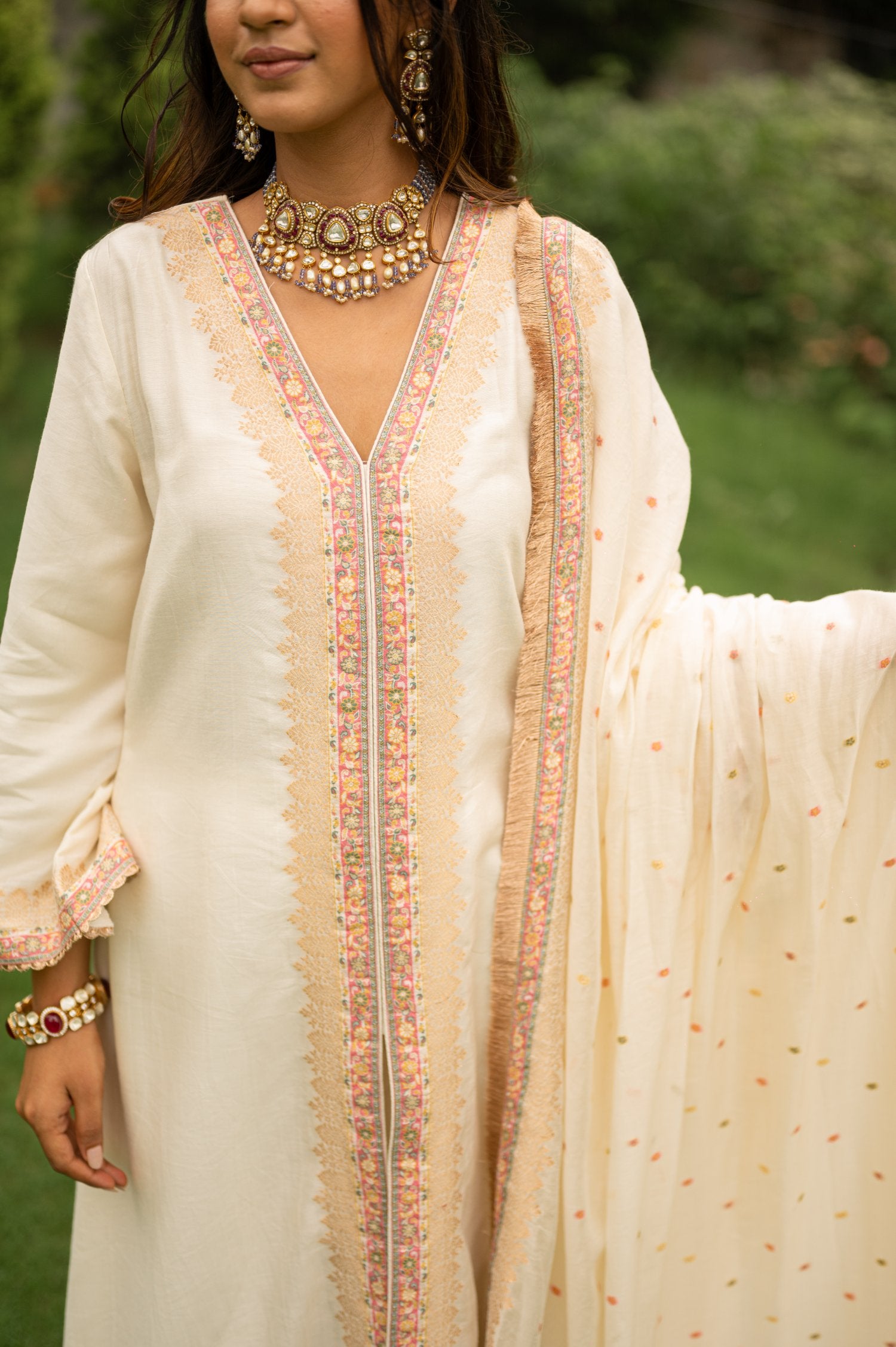 Introducing our elegant Woven Pearl white A-Line Kurta Set, made from soft and sustainable vegan silk. The design features a simple and straight silhouette with a matching dupatta and bottom, exuding timeless sophistication. Perfect for both casual and formal occasions, this set is a versatile addition to your wardrobe.