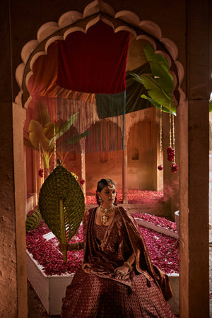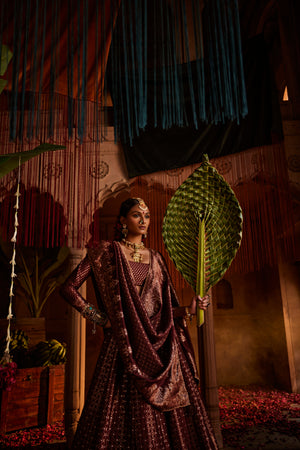 This deep burgundy lehenga is a celebration of elegance, perfect for making a statement at any grand occasion. Crafted with exquisite Zari Gota detailing, it features a beautifully woven flared skirt with delicate scalloping, a richly adorned blouse with intricate gold work, and a stunning patterned dupatta that adds depth and charm to the ensemble. A perfect blend of tradition and luxury, this lehenga is your key to effortless glamour.
