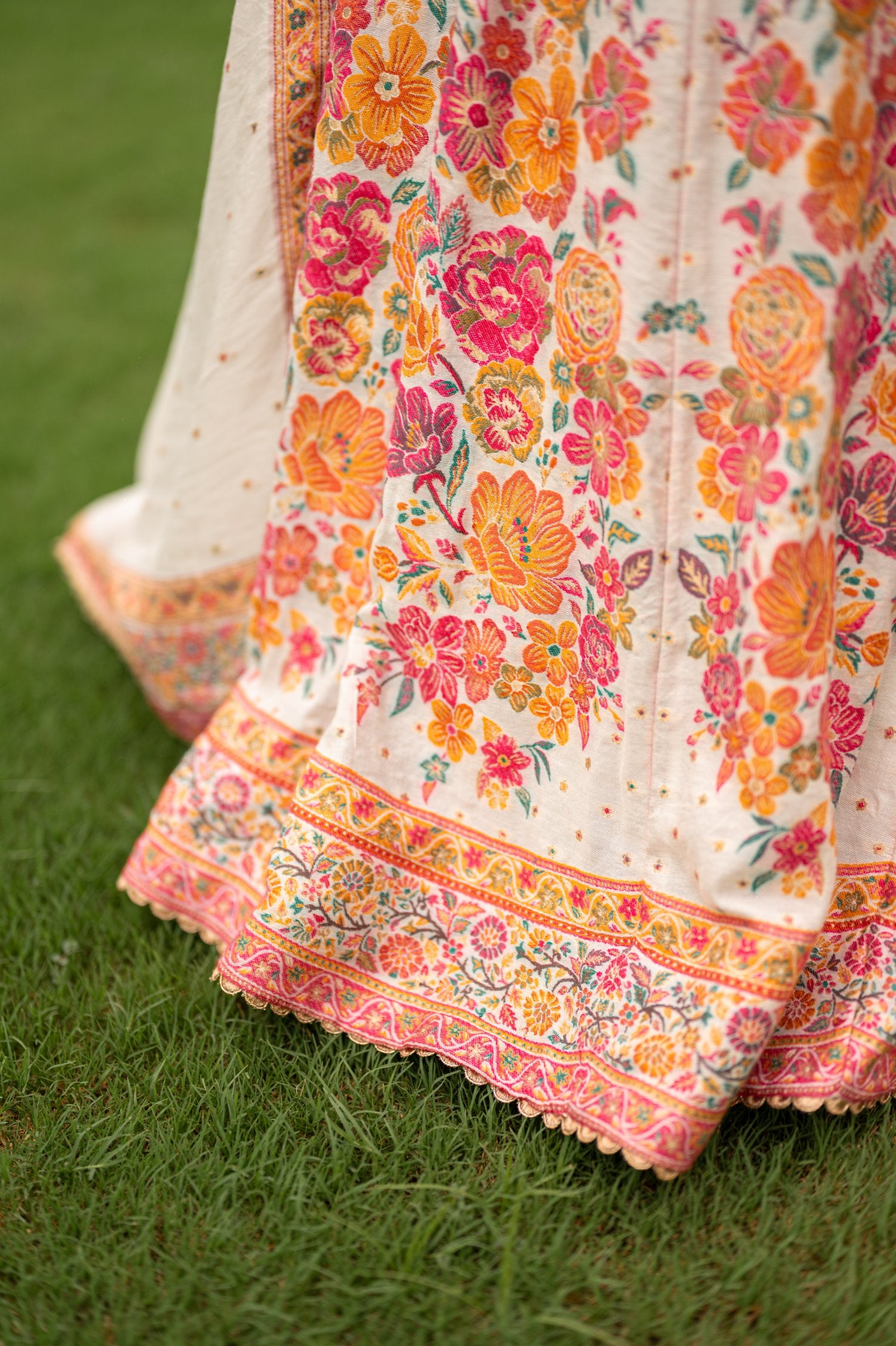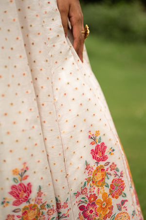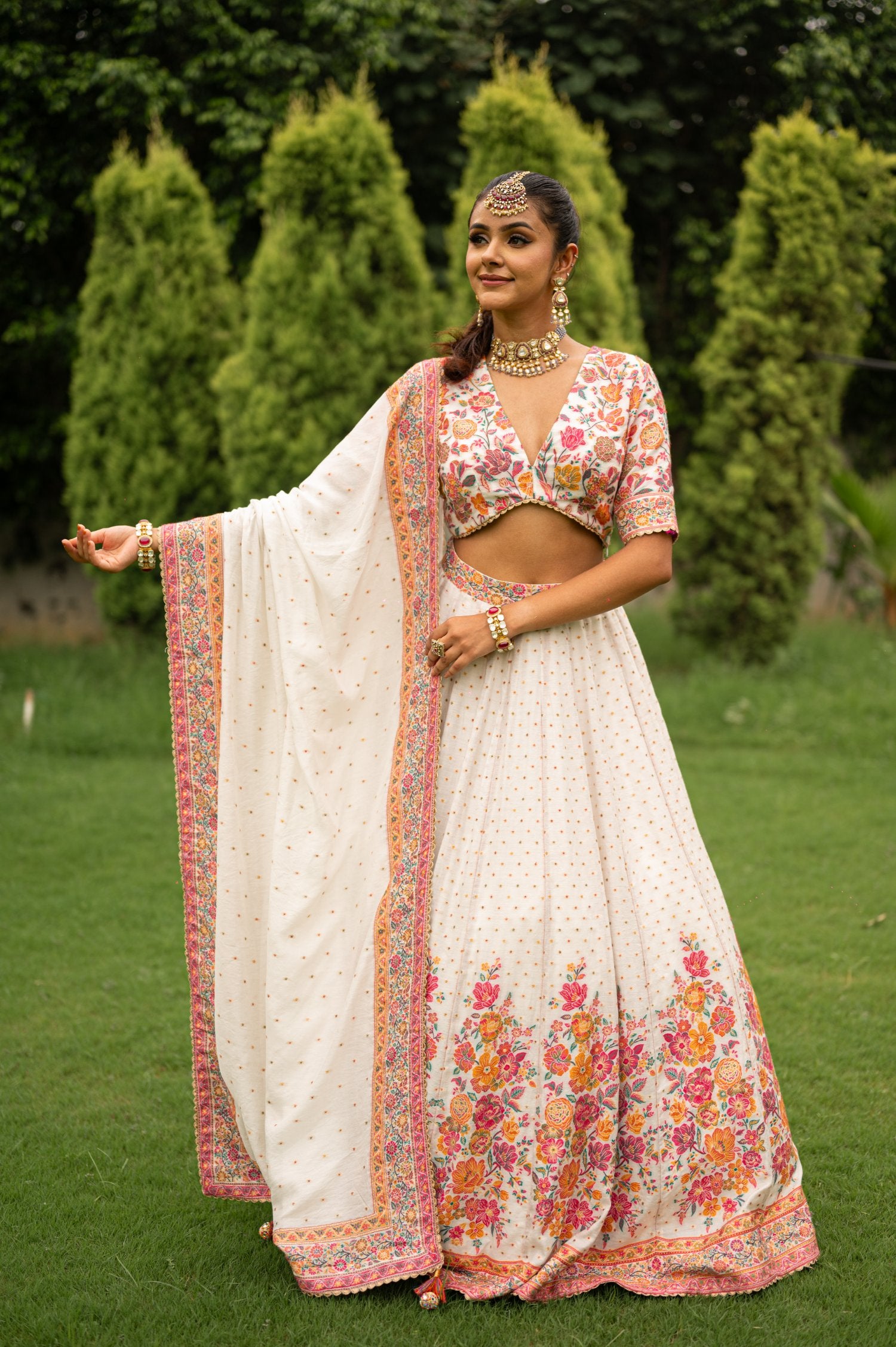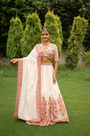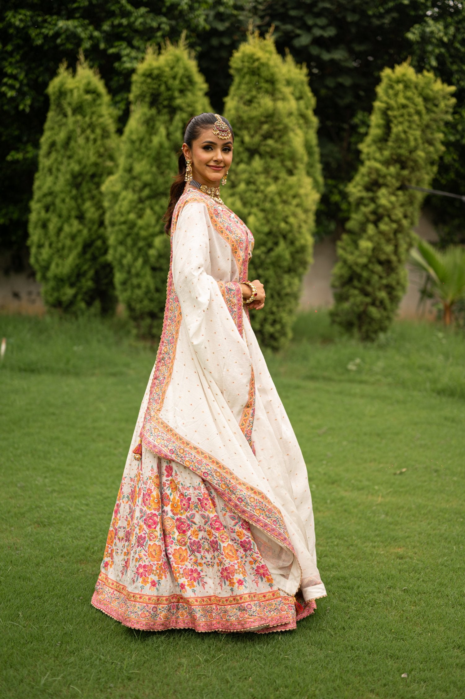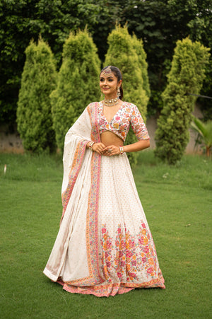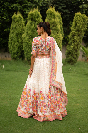 Unveil the epitome of grace with our White Woven Gulaabdaar Lehenga crafted from eco-friendly vegan silk. The pure white color radiates purity, while the magenta and orange floral design adds a touch of enchantment. The lehenga comes with a floral design blouse and light motif spread dupatta with four-sided border. This exquisite combination of elegance and sustainability makes it perfect for weddings and special celebrations.