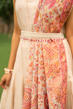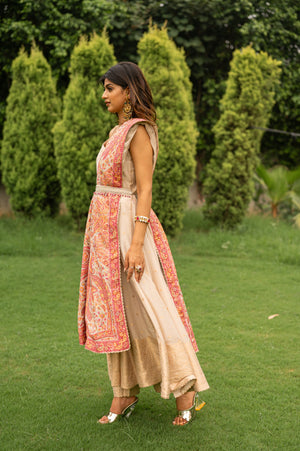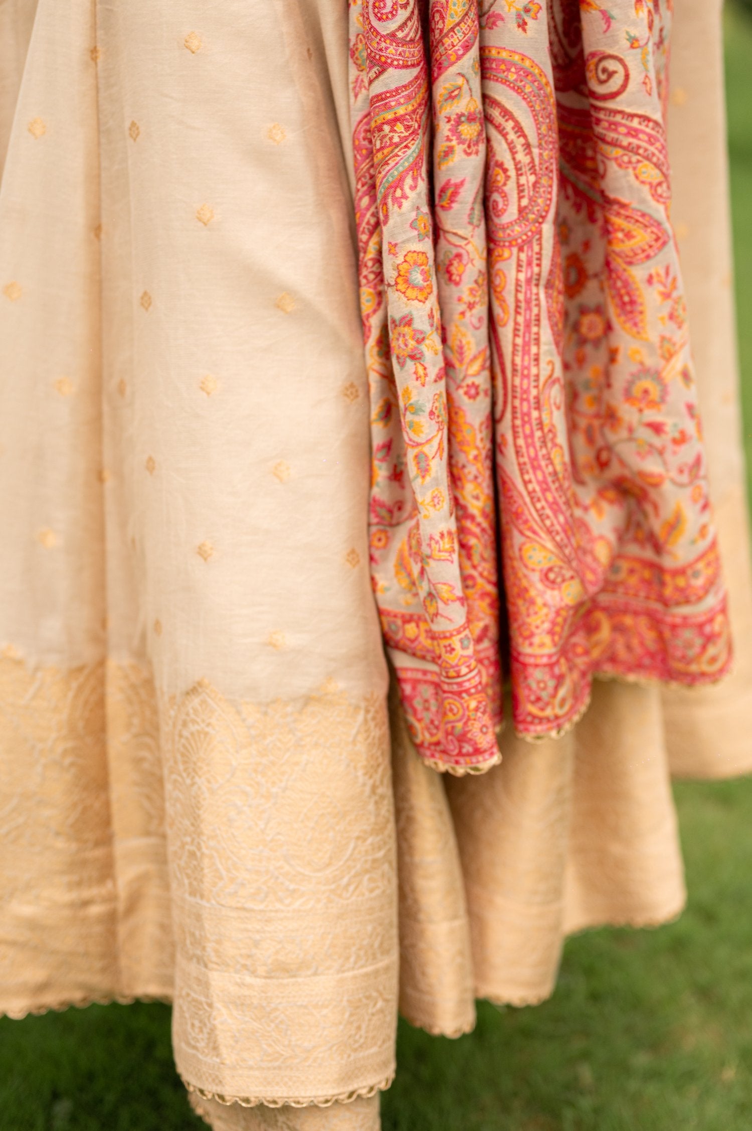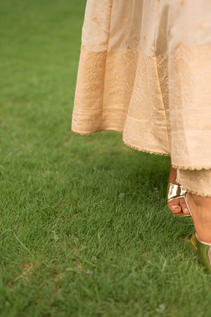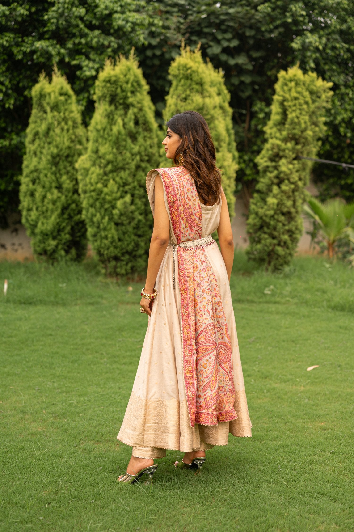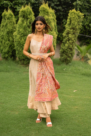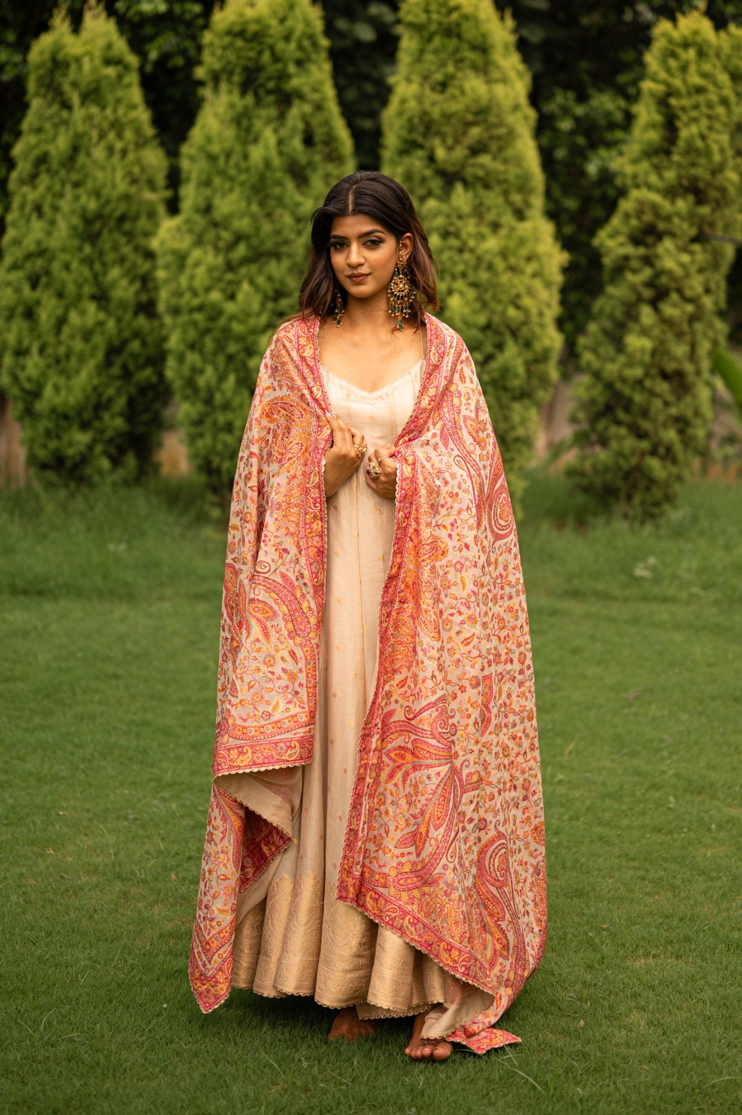 Indulge in the splendor of our light beige Woven Anarkali, exquisitely adorned with a multi coloured dupatta featuring intricate Kani weaving and opulent detailing. The Anarkali itself boasts a captivating golden zari thick border design and light spread motifs all over, elevating your elegance to new heights. Step into the spotlight with this mesmerizing ensemble, perfect for any grand celebration or cherished event.