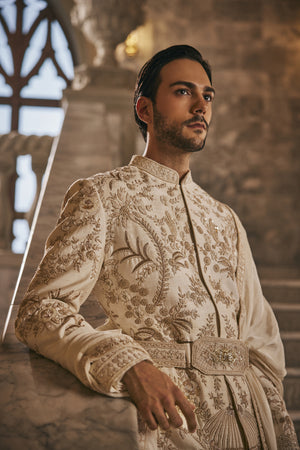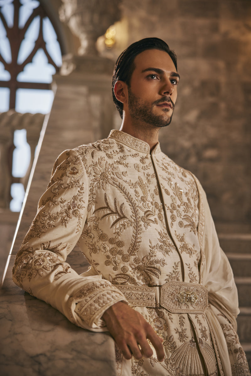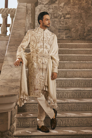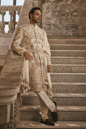 A majestic raw silk sherwani fit for royalty, adorned with golden Zari, zardozi, and nakshi work. The top half features delicate floral and leaf embroidery, while the bottom showcases an intricately embroidered horse motif and a castle at the center — evoking a regal king’s aura. Paired with a silk kurta, straight-cut silk pants, and a silk dupatta with a detailed border and tassels. A modern, uniquely styled belt cinches the waist, enhancing the silhouette. This sherwani is pure royal grandeur, reimagined.
