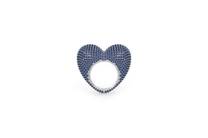 This love ring features a striking heart design encrusted with shimmering sapphires, creating a bold yet elegant statement piece. taking the centerstage in any outfit.