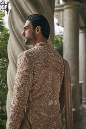 caramel brown sherwani, paired effortlessly with a finely tailored Anarkali kurta and churidar. The Anarkali features delicate same-tone thread embroidery, adding a touch of refined elegance. The sherwani is richly adorned with opulent zardosi, poat, and intricate hand embroidery, making it a true masterpiece of craftsmanship. A striking feature is the pair of majestic peacock motifs embroidered on the back, symbolizing grace and royalty. Perfect for the modern groom, this ensemble blends heritage with a bold, royal presence.