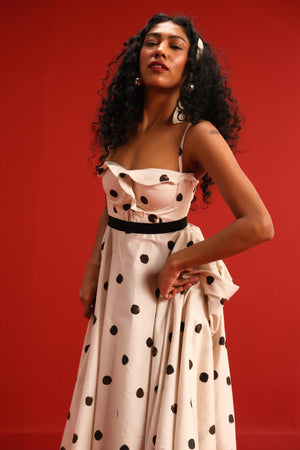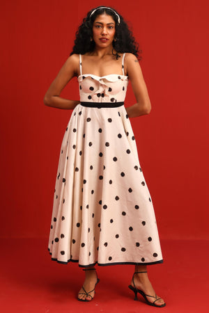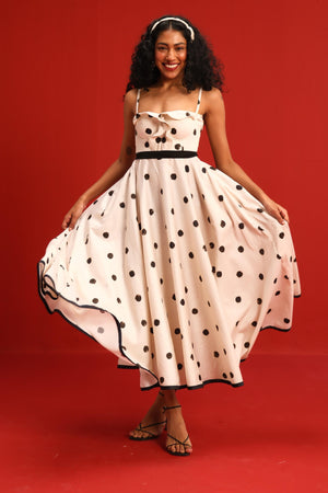 Designed in a soft ivory hue sprinkled with bold black polka dots, this midi dress features a sweetheart neckline with delicate ruffle detail, slim shoulder straps, and a cinched black waistband that flatters the figure. The full circle skirt and black piping at the hemline add graceful movement and structured elegance—perfect for sunlit days or moonlit dancing.