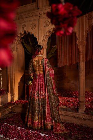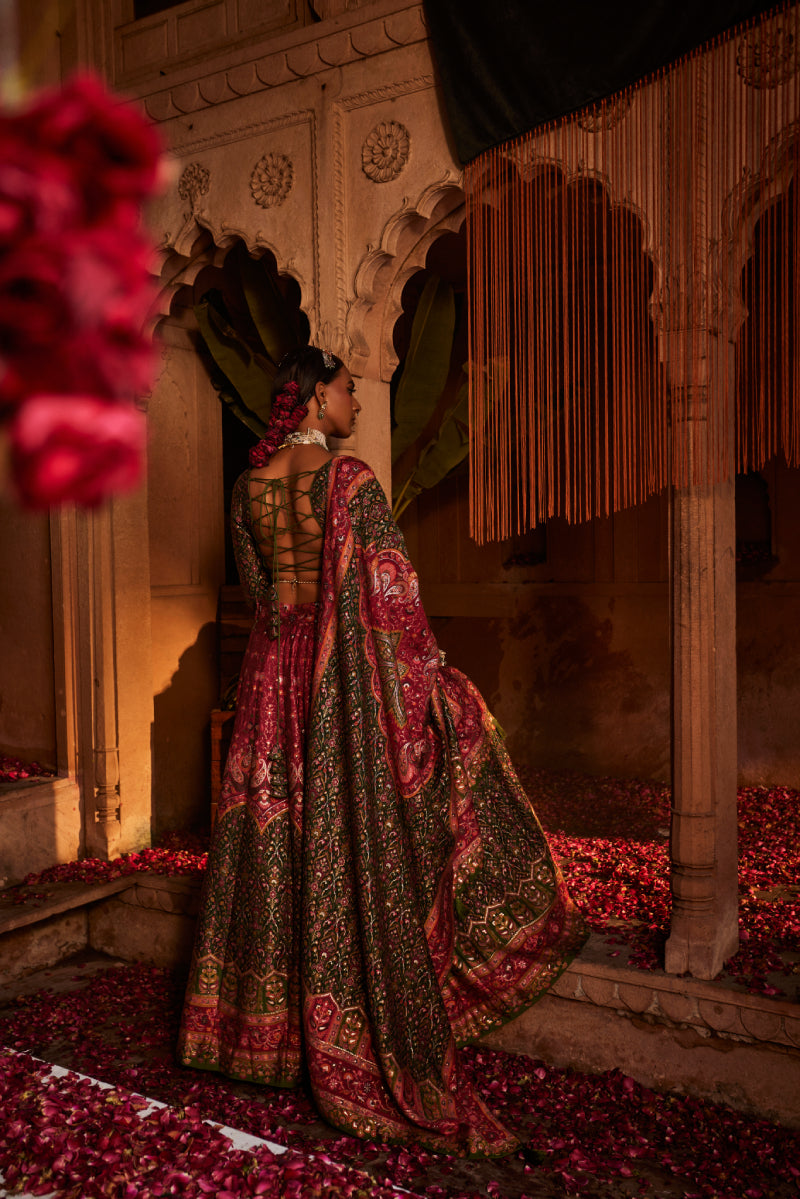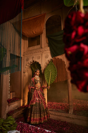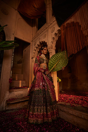 The Mor Mahal Lehenga in a stunning magenta-green palette is a true masterpiece of Indian craftsmanship. Expertly crafted from luxurious vegan silk, it is perfect for weddings and grand celebrations. Intricate embroidery and delicate beadwork elevate its elegance, adding a regal touch to the ensemble. Complete with a matching blouse and a beautifully adorned dupatta, this lehenga exudes timeless sophistication and grace.