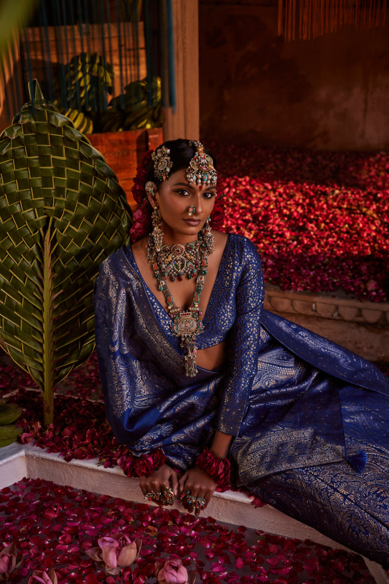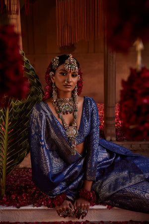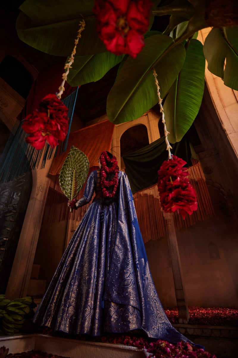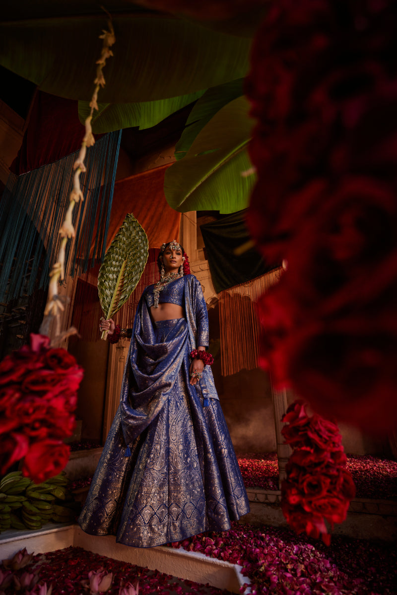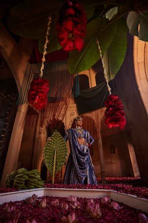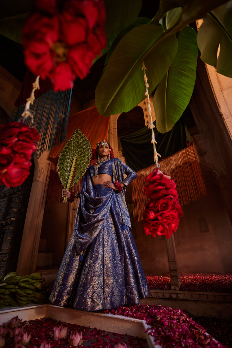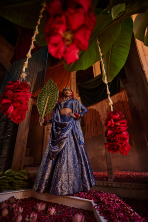 This Persian blue lehenga, adorned with intricate patterns, is the epitome of glamour and charm, perfect for special occasions. Crafted from luxurious vegan silk, it offers a guilt-free indulgence with a comfortable fit. The ensemble is elevated by exquisite Zari Gota detailing, while the heavily woven coordinating dupatta, adds a regal touch. Make a statement with this timeless masterpiece!