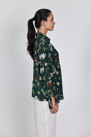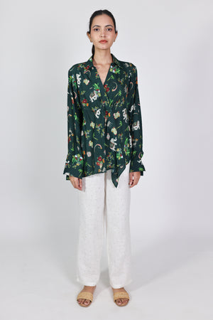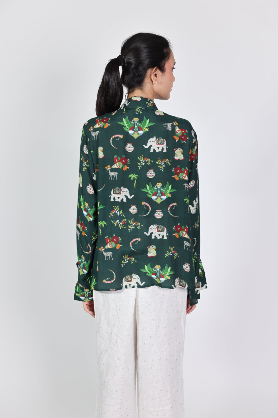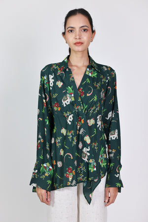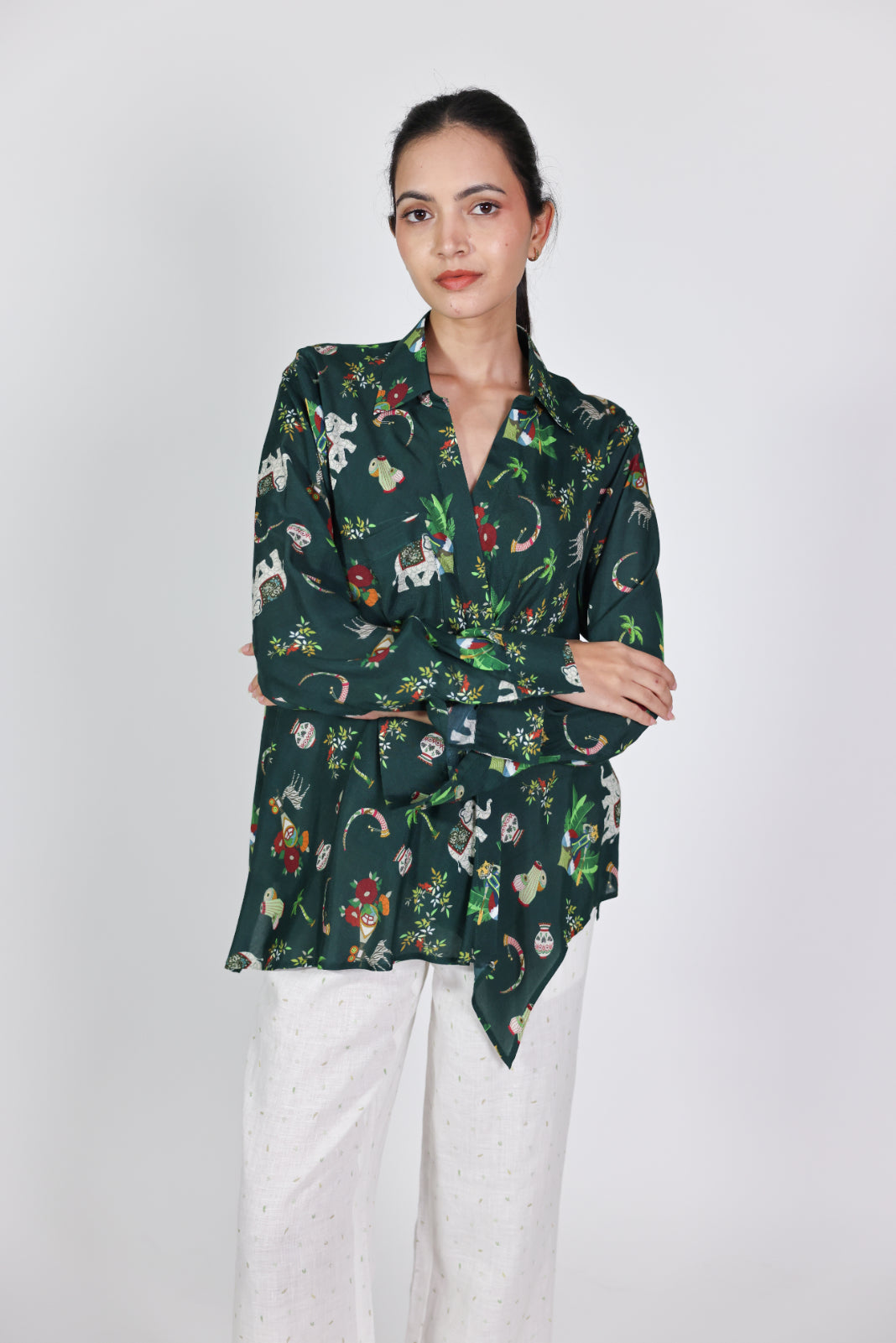 Our Bestseller, The Hidden Honey Shirt. A Draped Satin Shirt With Tuck Detailing, An Open Collar, And Assymetric Hem, This Time With Vibrant Print Inspired By Kerala Theyyam Folklore And Culture.