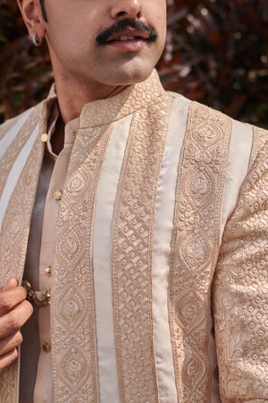 Elevate your style with this refined menswear ensemble that exudes contemporary elegance. The standout piece is a short, open-front jacket in a sophisticated beige hue, adorned with intricate beige threadwork in sleek strip patterns, offering a modern yet timeless aesthetic.Paired seamlessly with a glass organza shirt, this ensemble adds an ethereal touch with its sheer, lightweight fabric, perfect for layering with understated luxury. Completing the look are beige solid pants, tailored for a sharp and polished finish, ensuring ltimate comfort and style.This ensemble is the perfect blend of minimalism and sophistication, ideal for wedding occasions or a statement-making look.