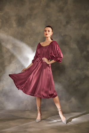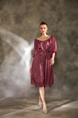 Dark purple organza satin dress with front open button look and a tie belt