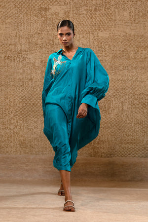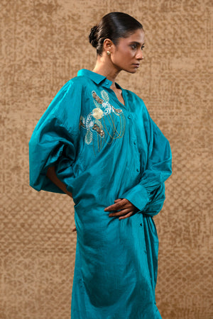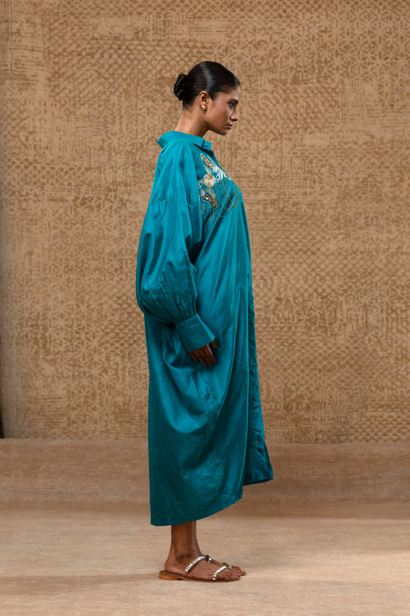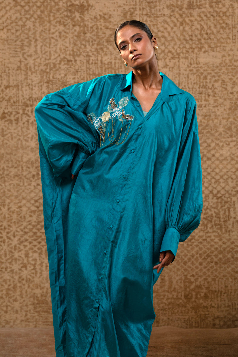 A relaxed-fit silk dress with sculpted sleeves and delicate chain embellishment. Designed to flow effortlessly while making an impact — this piece blends comfort with drama.