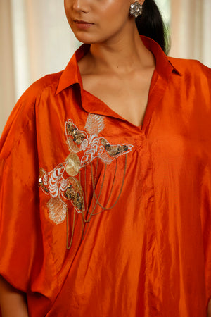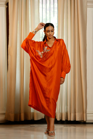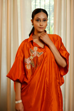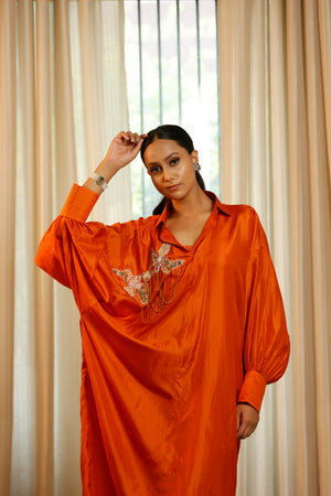 A relaxed-fit silk dress with sculpted sleeves and delicate chain embellishment. Designed to flow effortlessly while making an impact — this piece blends comfort with drama.
