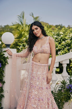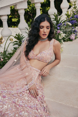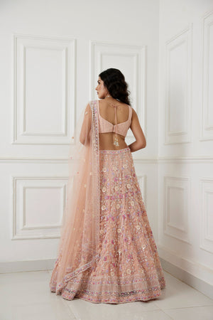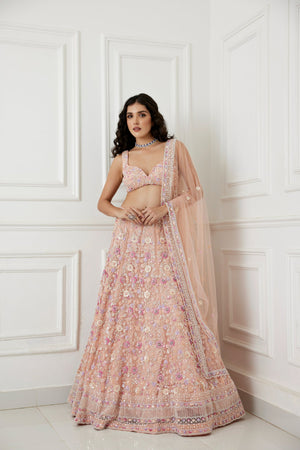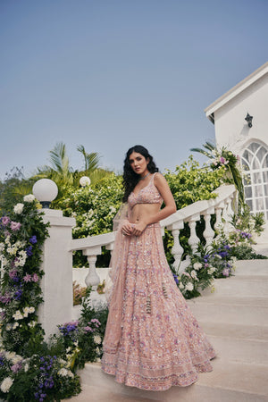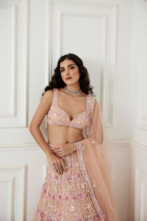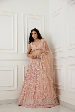 Dusty Peach Tulle Skirt With Fine Sequence Embroidery In Glamourous Hues Paired With A Dainty Blouse And Embroidered Tulle Dupatta.