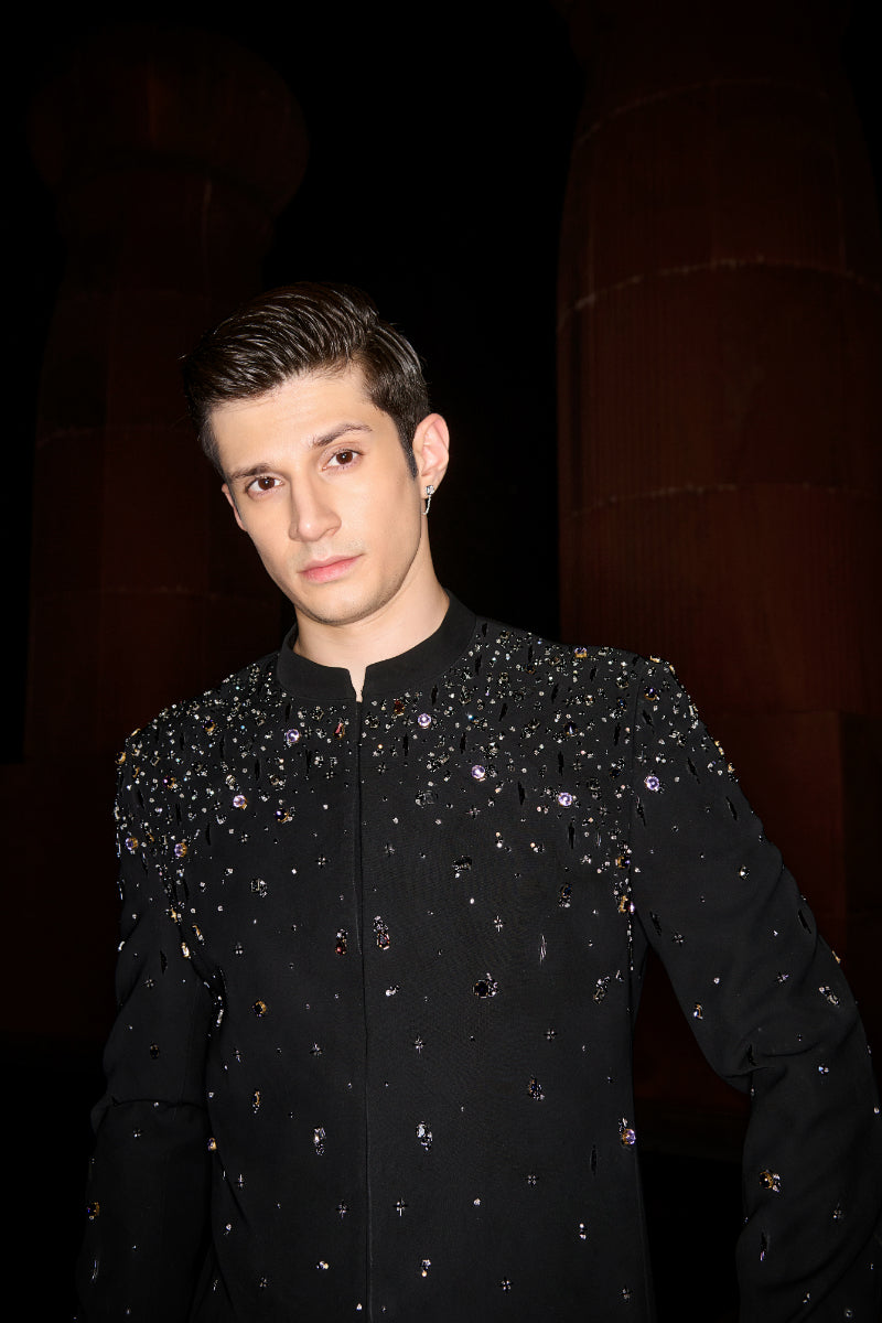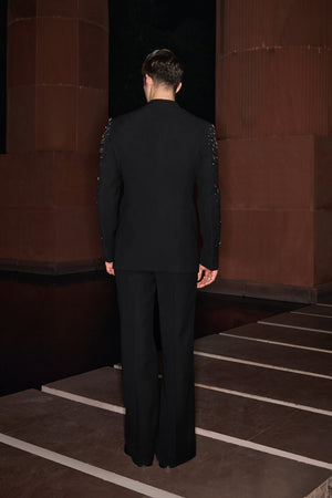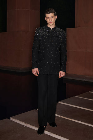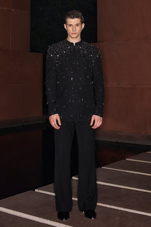 An all-black bandhgala beautifully adorned with vibrant colored stones and crystals, paired with matching pants