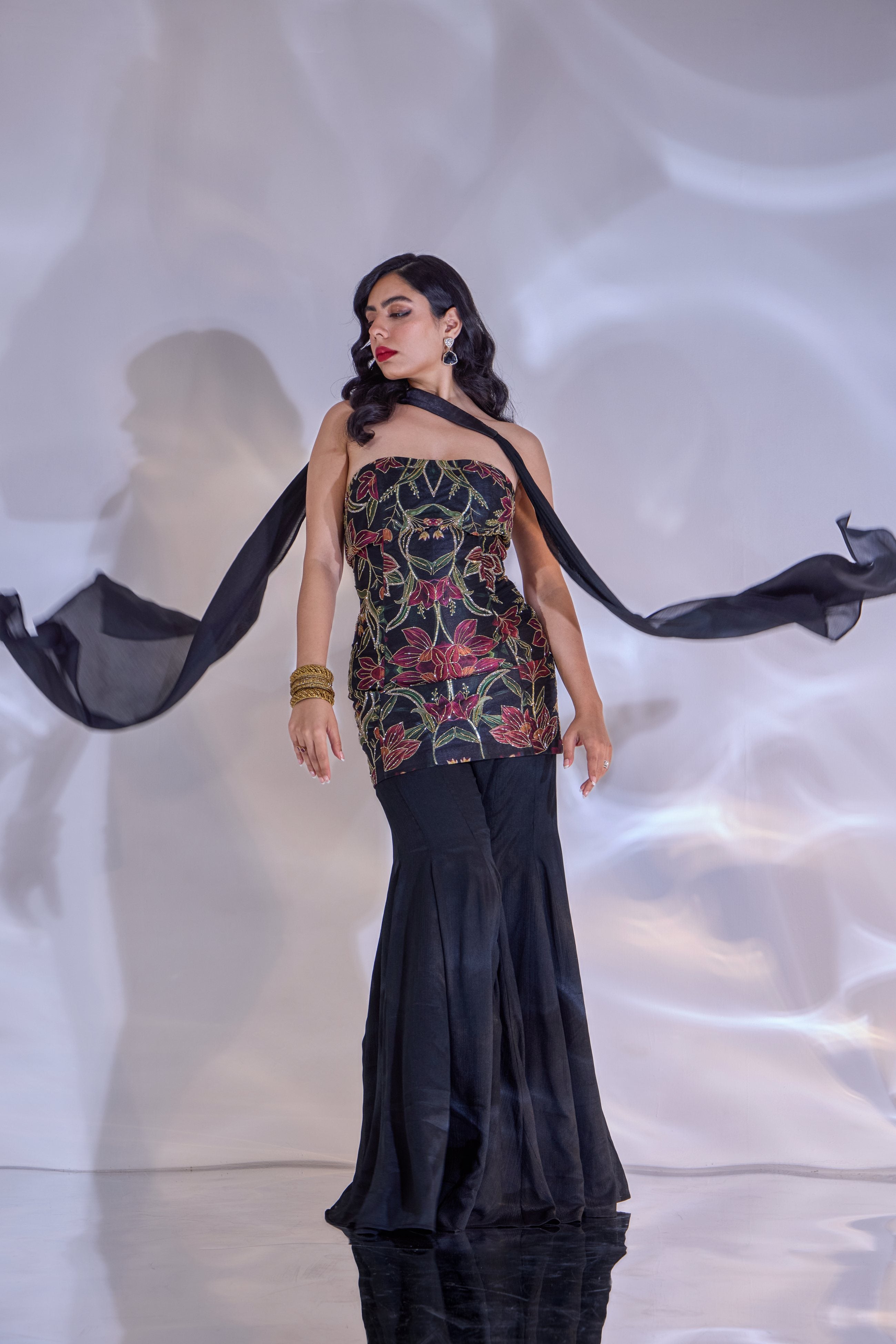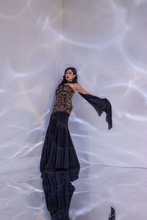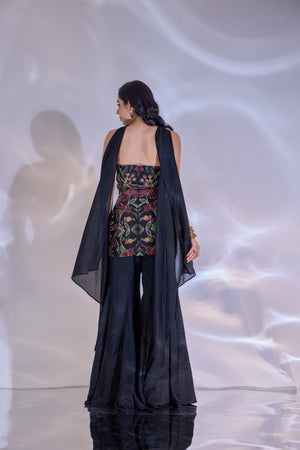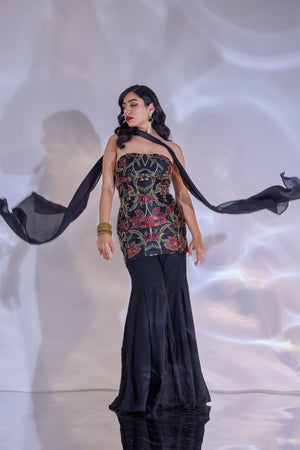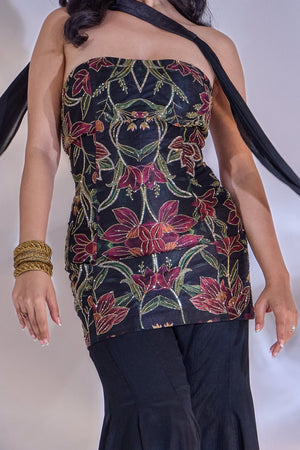 BLACK HAND EMBROIDERED TUBE TOP PAIRED WITH SATIN CHIFFON FLARED PANTS AND CHOKER SHRUG