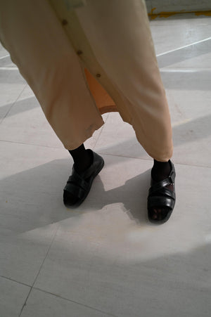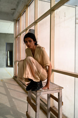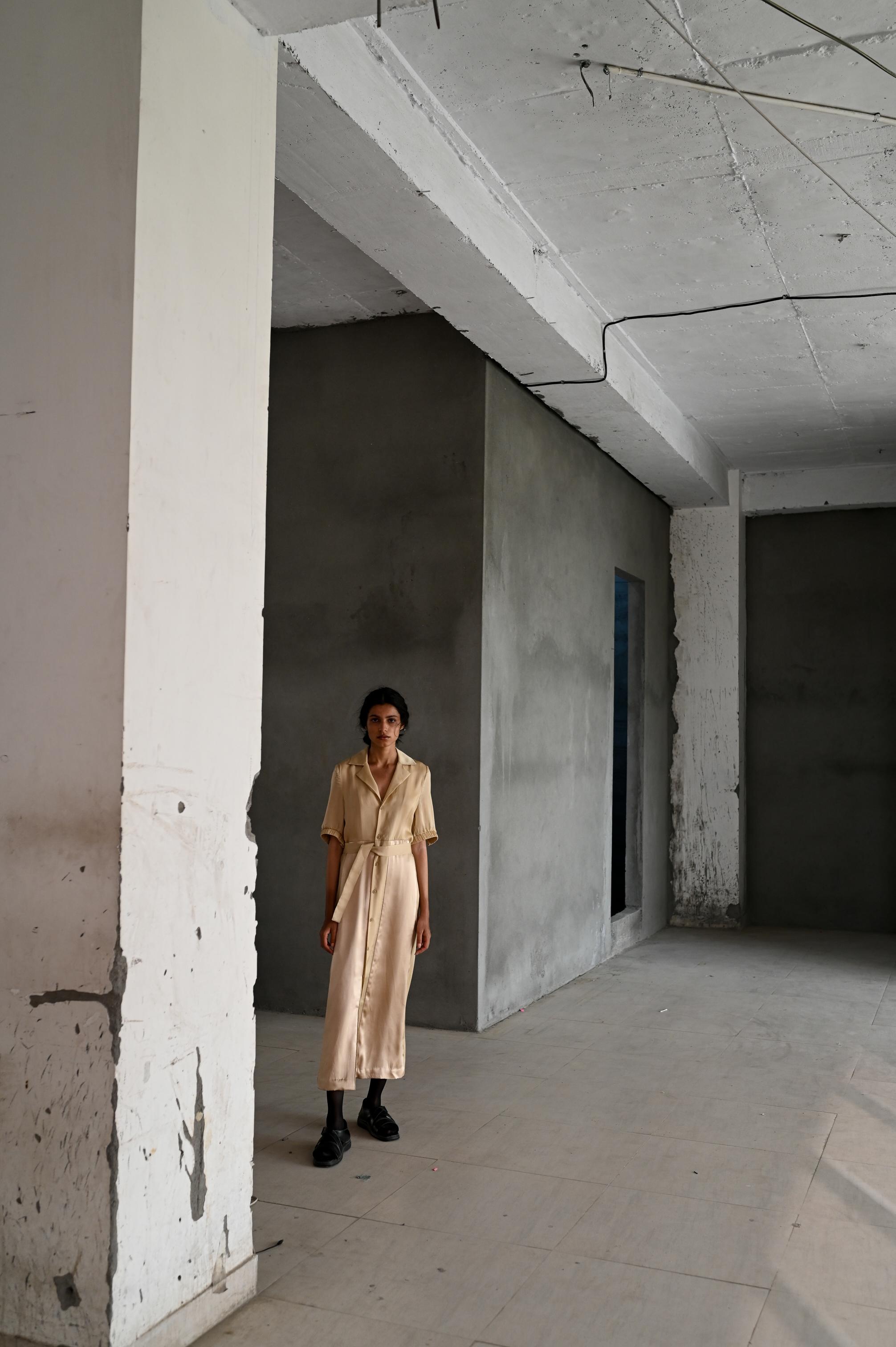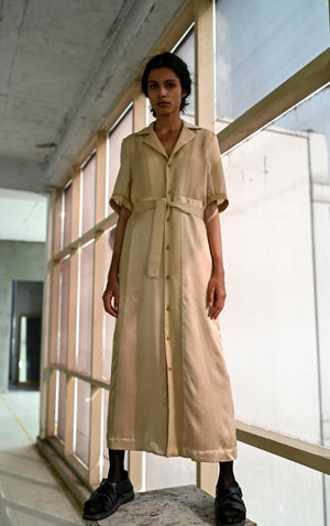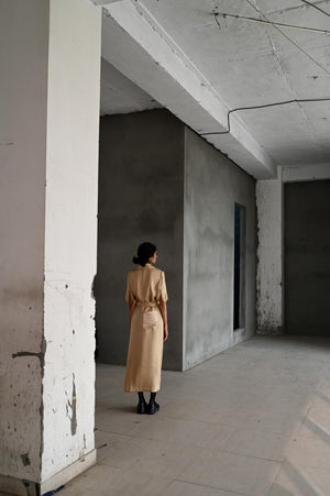 Elasticated jacket Dress with panelled front with attached waist belt andone patch pocket at the back.