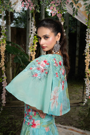 Inspired by tropical serenity, this aqua blue ensemble captures the essence of effortless glamour. The fluid skirt paired with a chic bustier and a statement jacket creates a striking silhouette, while the delicate hand embroidery elevates its artistry. Ideal for daytime weddings, brunches, garden parties and luxury holiday wear.