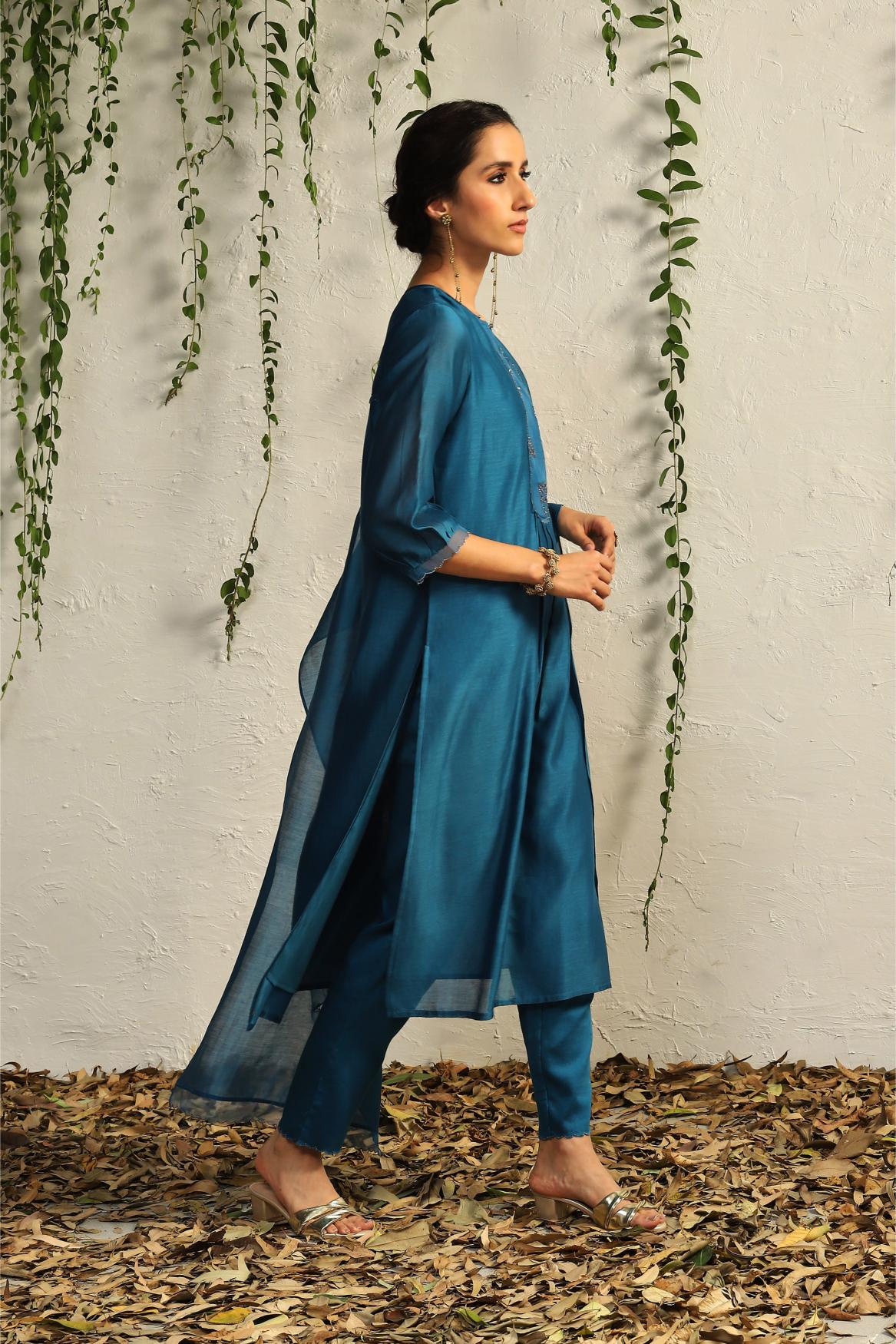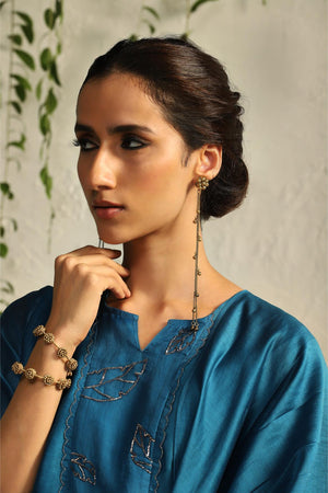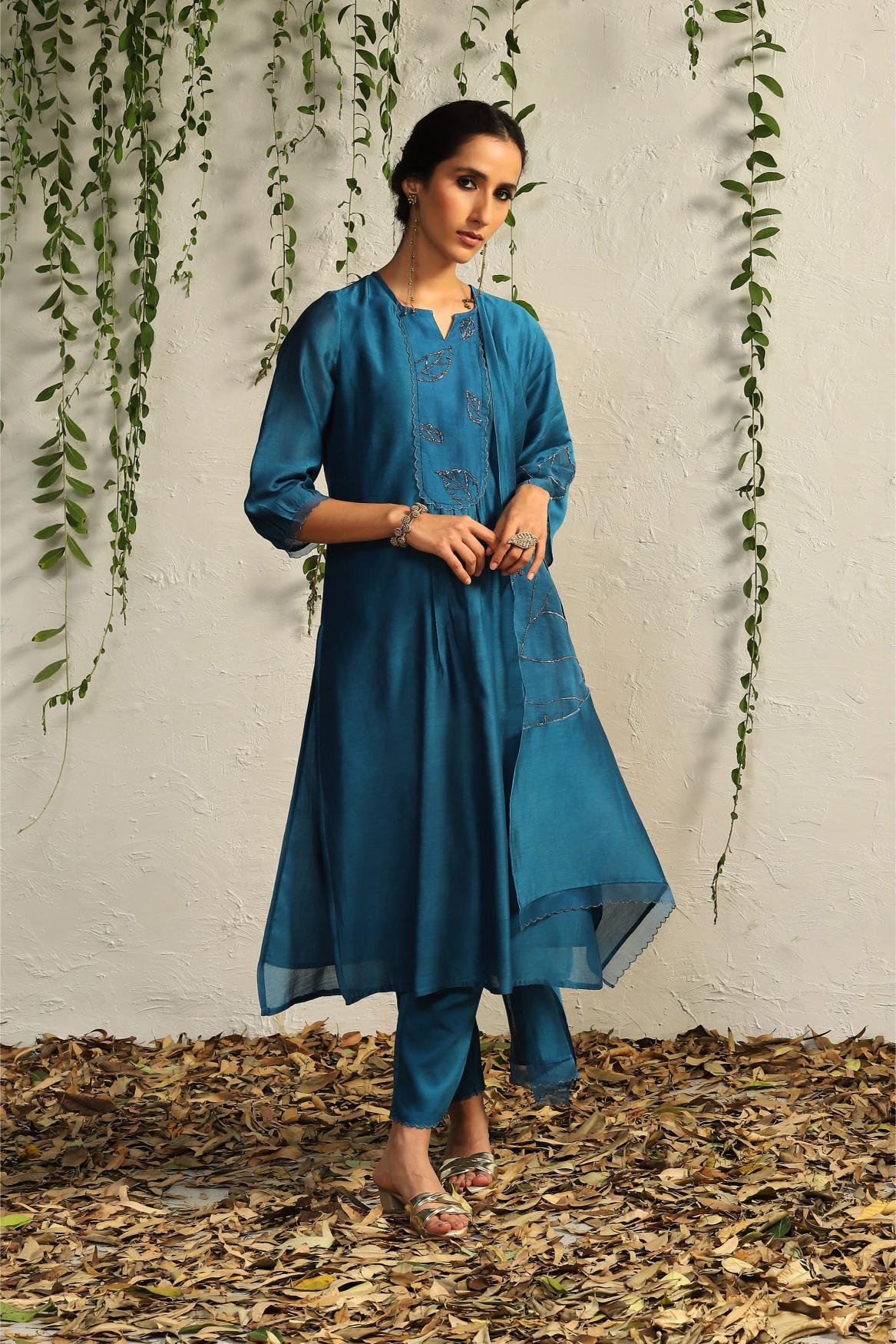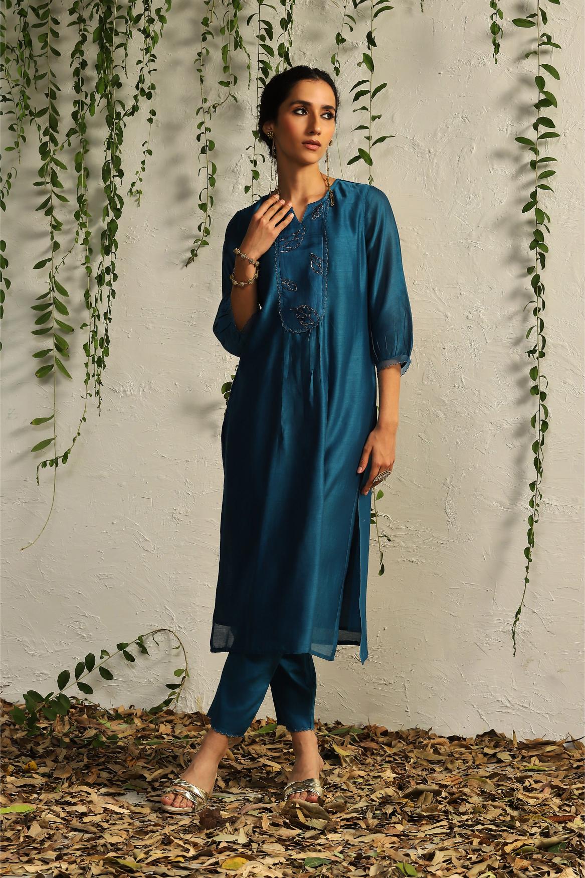 "The timelessness of nature inspired motifs is interpreted through hand embroidered leaf motifs in our true blue relaxed fit kurta set. The decadence is enhanced with our intricate nakshi and zari work.