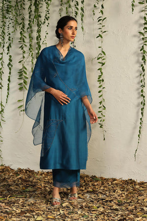 This true blue kurta set in a straight silhouette with side slits and beautiful scalloped neckline is elegant and enchanting. Designed with intricate nakshi and zari antique silver hand embroidery , this contemporary ensemble is ideal for your festive celebrations.