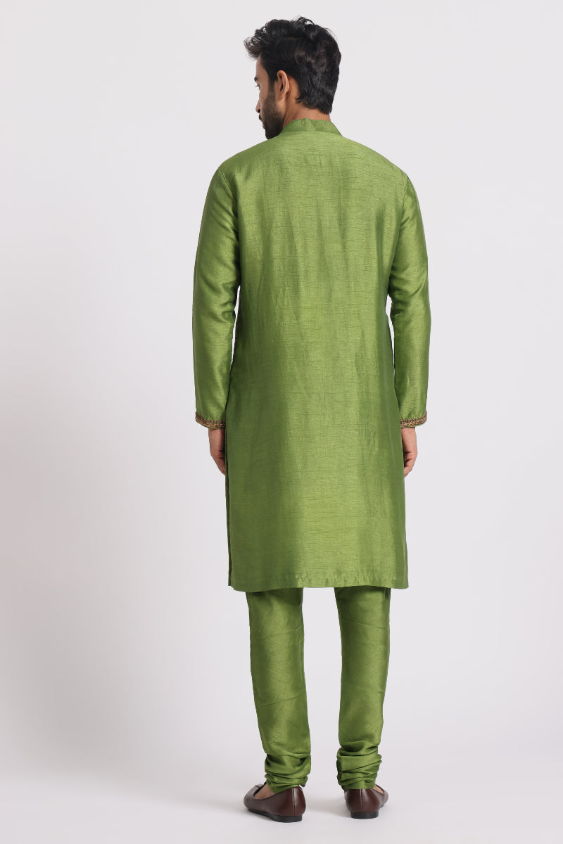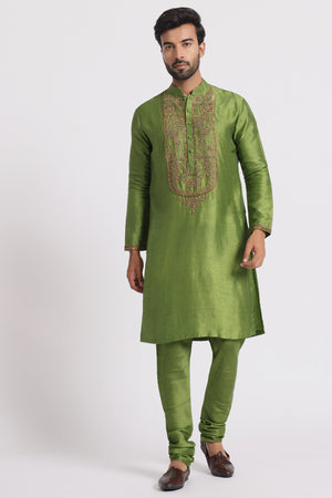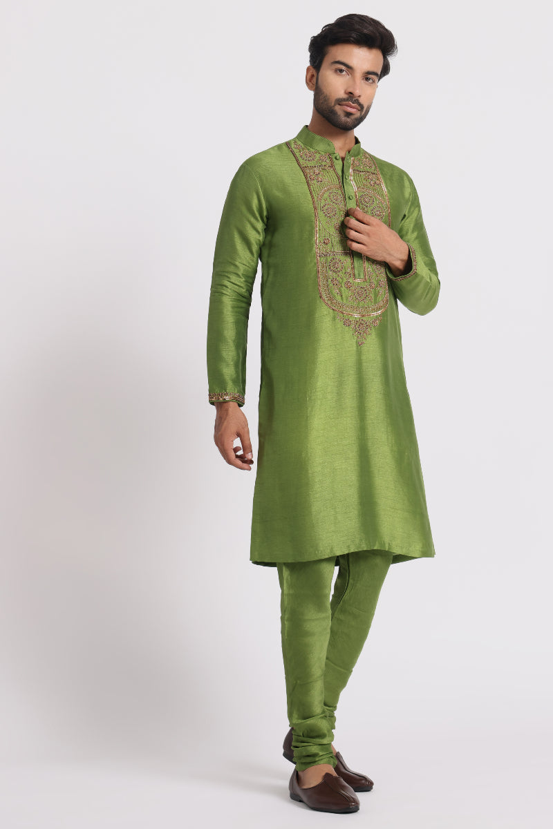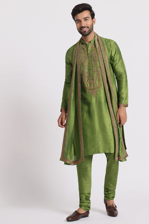 The elegant olive green kurta set is crafted from luxurious Chanderi fabric, featuring exquisite golden hand embroidery delicately adorning the neckline and sleeves. This graceful ensemble is paired with a matching olive churidar and a beautifully embroidered stole, perfect for adding a touch of traditional charm to any occasion. Color :- OLIVE GREEN