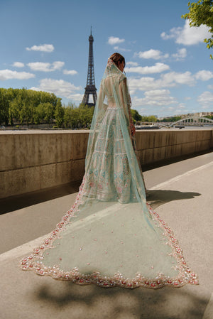 Elegant and captivating, this Turquoise Green Lehenga Set exudes timeless charm. Handcrafted embroidery adorns the vibrant raw silk and velvet lehenga, complemented by a net and raw silk blouse. A matching net dupatta completes the ensemble, promising grace and sophistication
