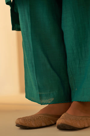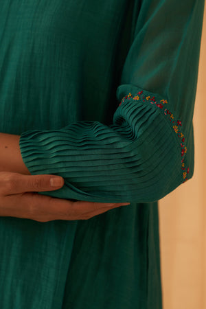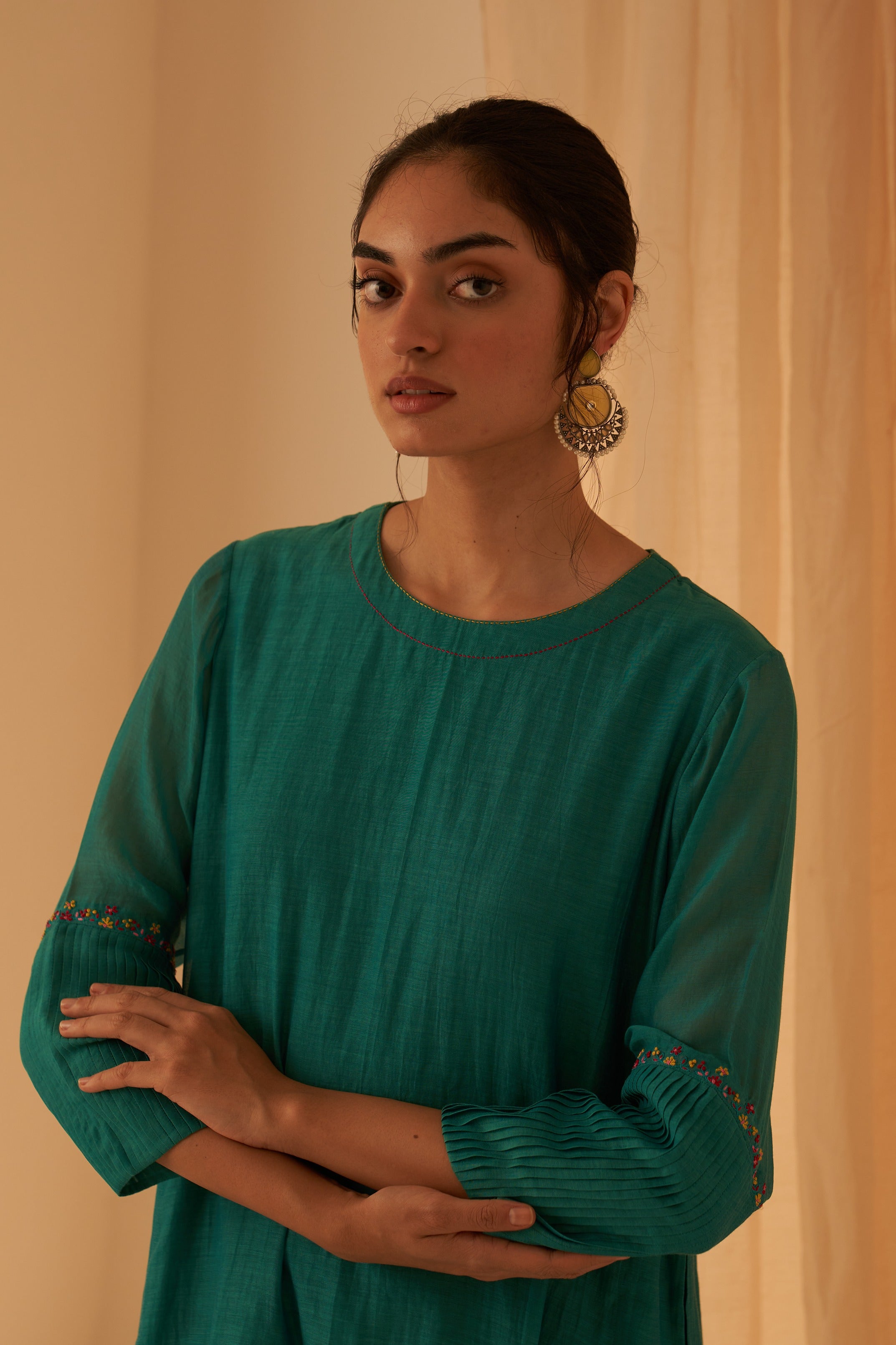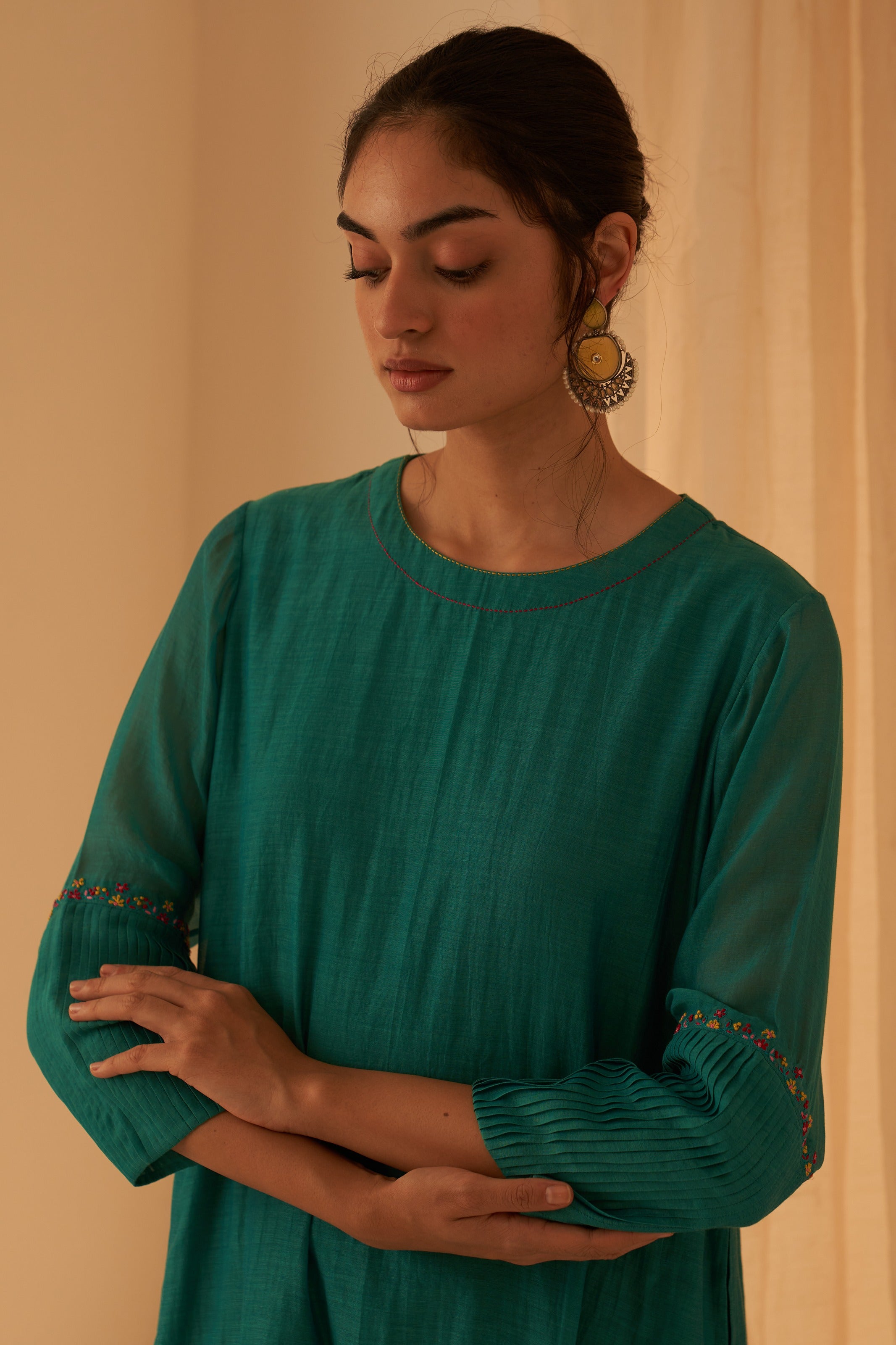 A bold yet serene ocean-hued turquoise Chanderi kurta, featuring pintuck box pleats, floral embroidery on the sleeves, and a back buta. Paired with matching pant and an organza dupatta, it’s a perfect blend of structure and elegance.