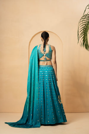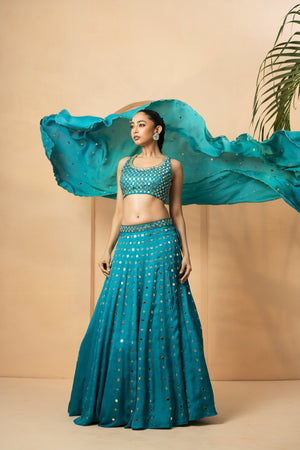 Featuring a turquoise lehenga made of modal satin fabric, with intricate mirror and pearl beads embellishment all over lehenga, blouse and dupatta.