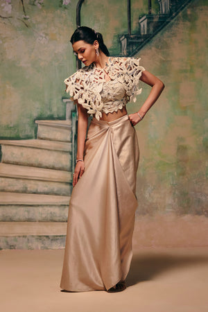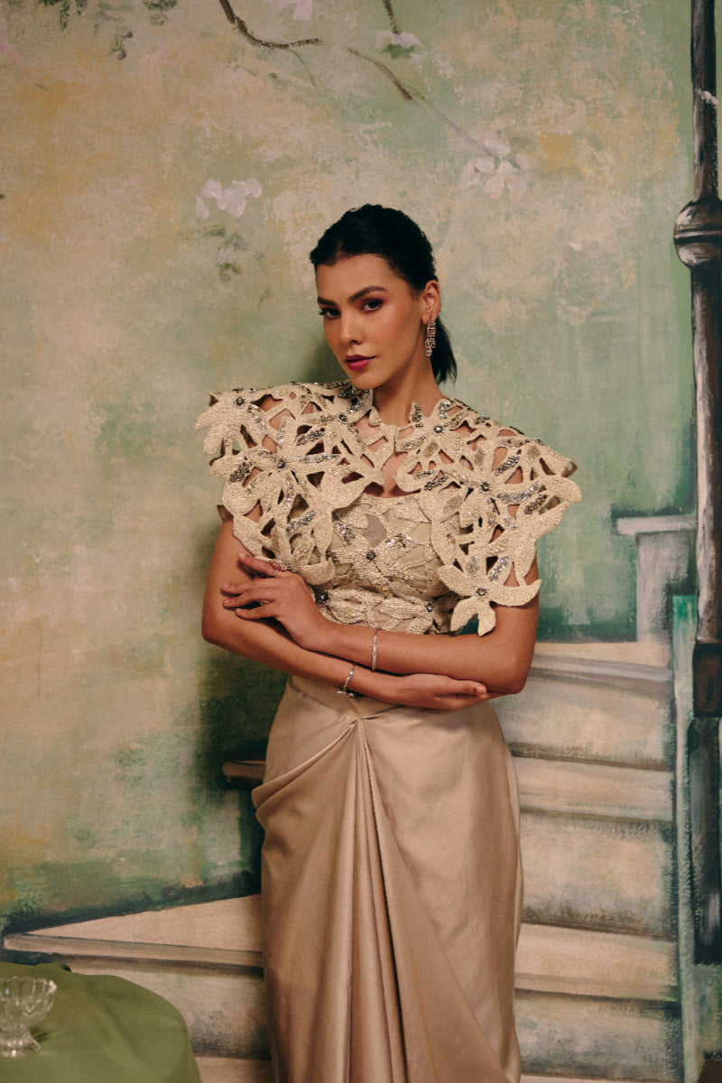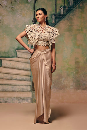 This elegant three-piece ensemble features an intricately crafted cutwork lace crop top layered with a dramatic power-shoulder cape, creating a sculptural couture silhouette. Paired with a fluid champagne-toned drape skirt, it balances structure with soft movement. The interplay of texture, detailing, and strong shoulders gives this look a bold yet refined presence. Perfect for cocktail evenings, engagement celebrations, and high-fashion festive occasions.
