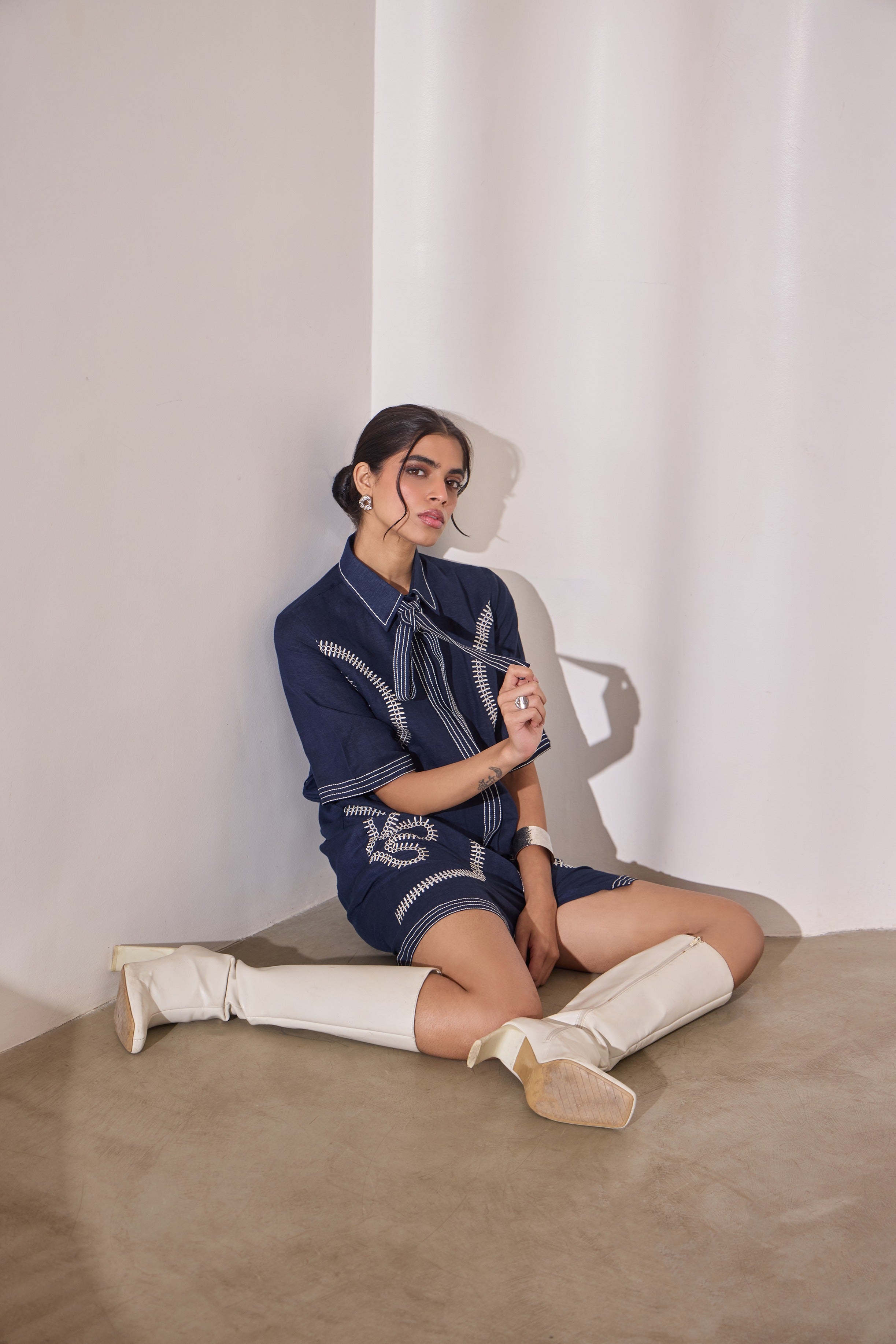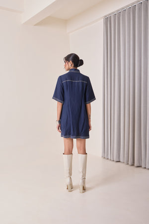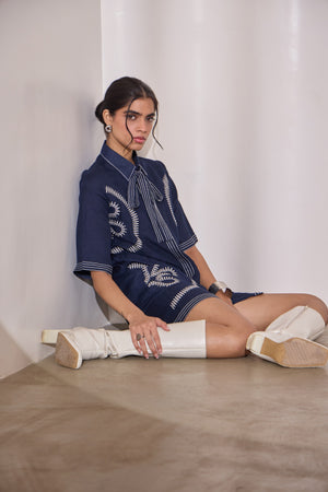 A playful navy mini dress designed to make a statement — finished with contrasting creme embroidery and a detachable tie belt that can be styled at the neck or waist. Crafted for comfort with a flattering fit, it’s the perfect balance of ease and style: young, versatile, and instantly standout.