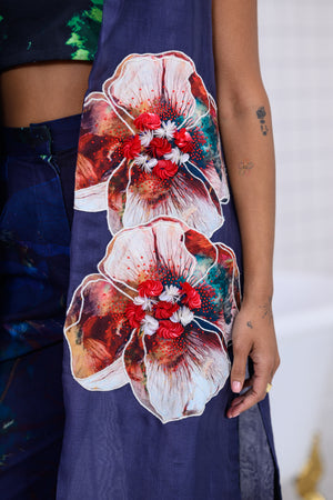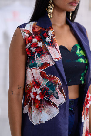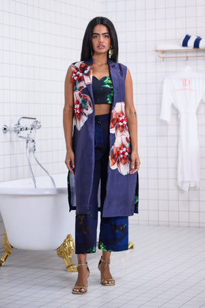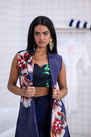 This three-piece set is an artful balance of bold structure and ethereal flow, designed for the modern muse who effortlessly blends power with grace. Crafted in luxe cotton and sheer organza, this ensemble offers a layered narrative of texture, print, and movement. he sleeveless organza jacket in a deep twilight hue is adorned with photogenic 3D floral embroidery in ivory and red, creating a bold, artistic contrast. Its elongated, sleek silhouette drapes effortlessly, adding a layer of elegant drama. The structured bustier features a feminine scalloped neckline against a navy blue base highlighted with contrast neon green print framed by precise stitch detailing, enhancing its sculpted fit.The tailored trousers mirror the bustier’s print, with a cropped hemline and subtle flare, bringing a modern, sharp edge to the silhouette.
