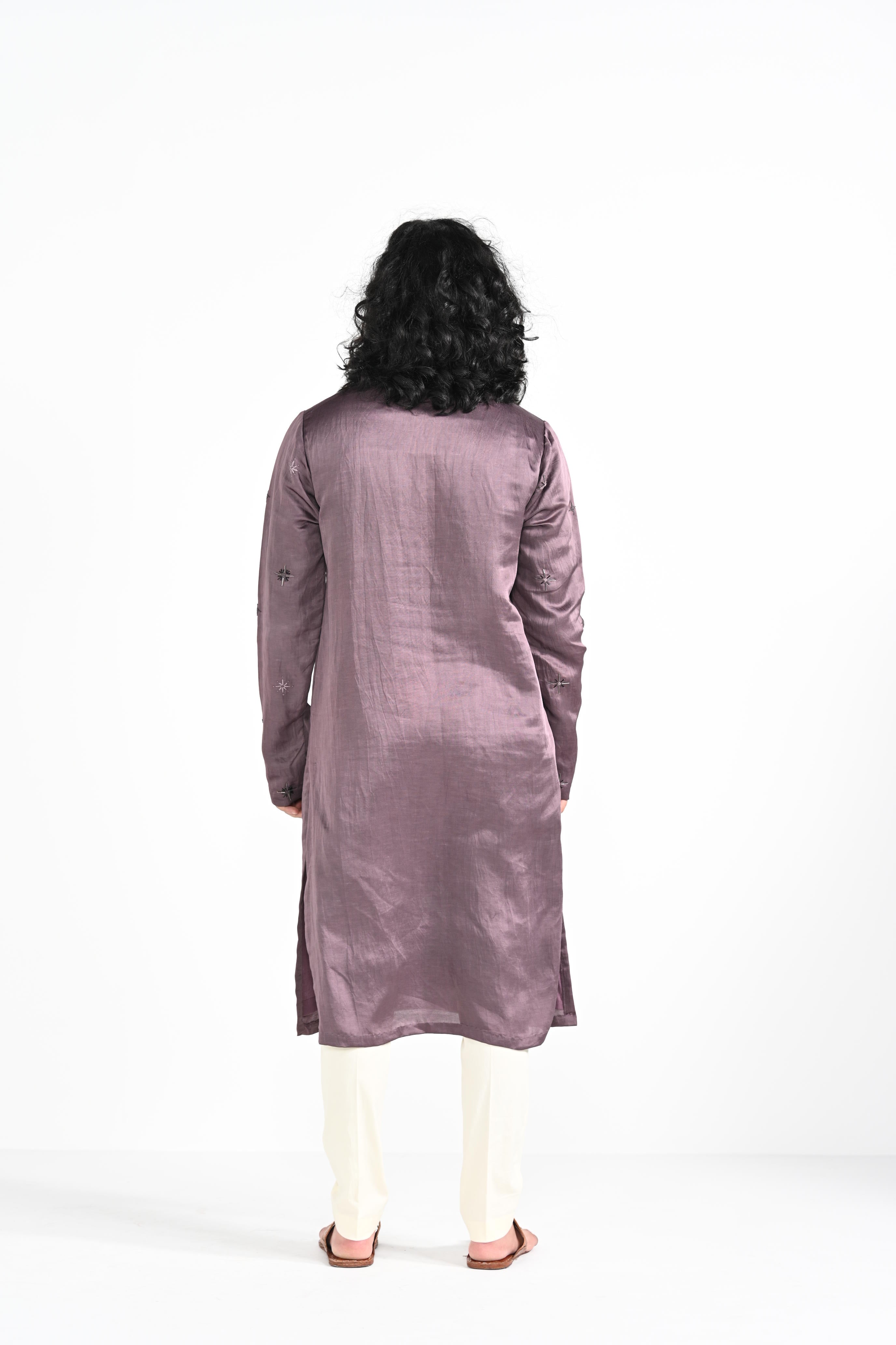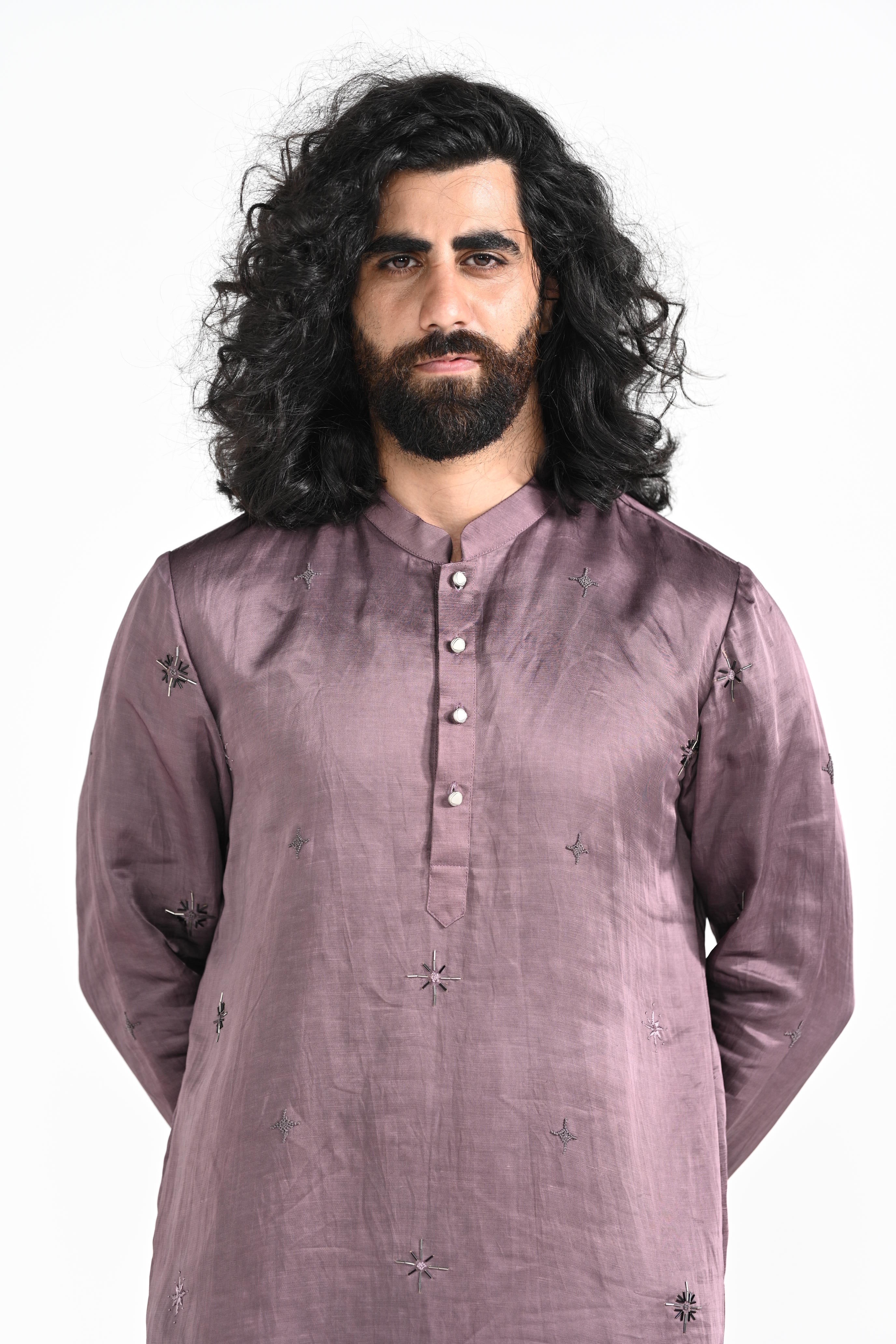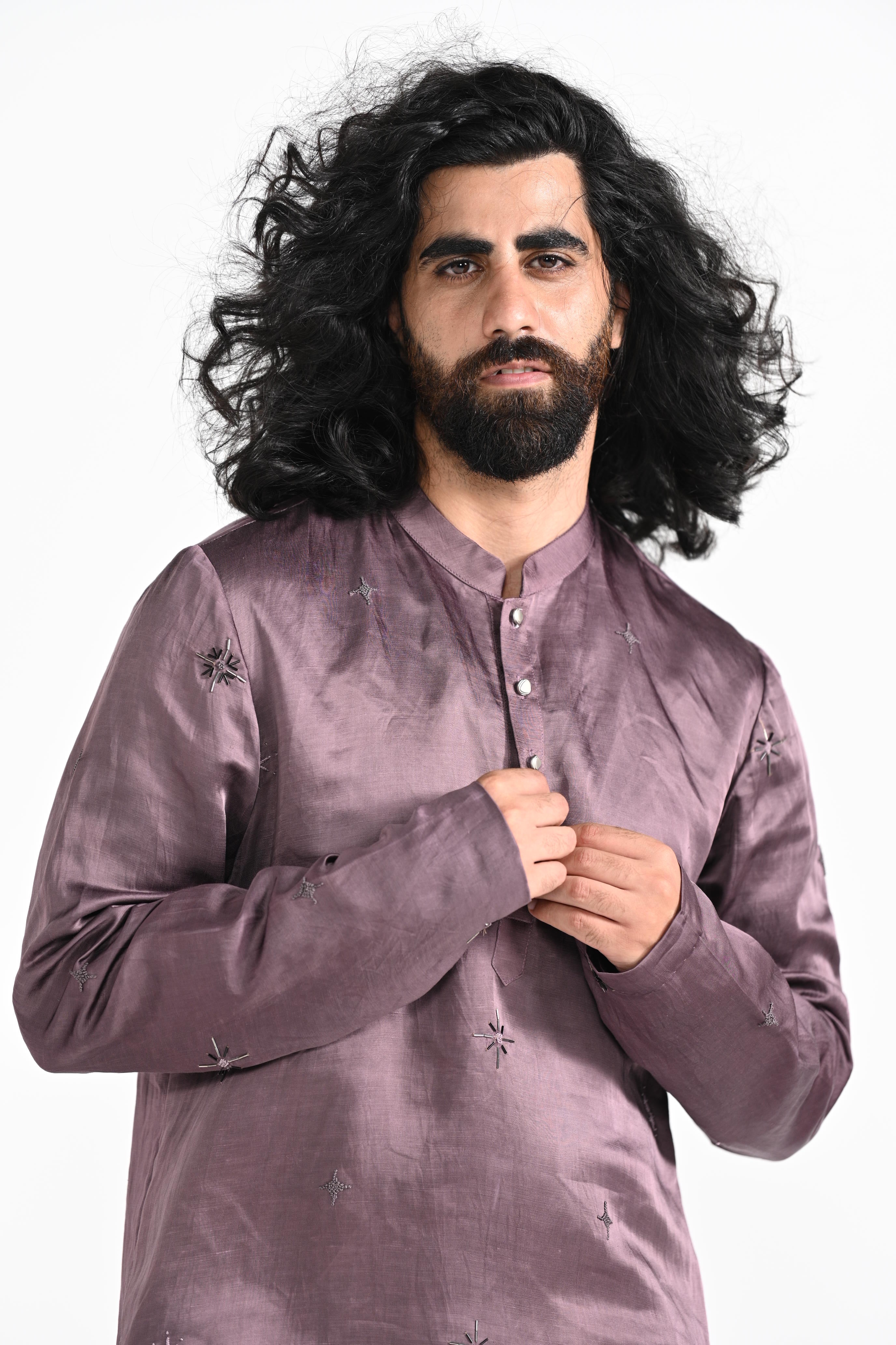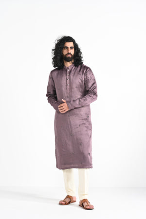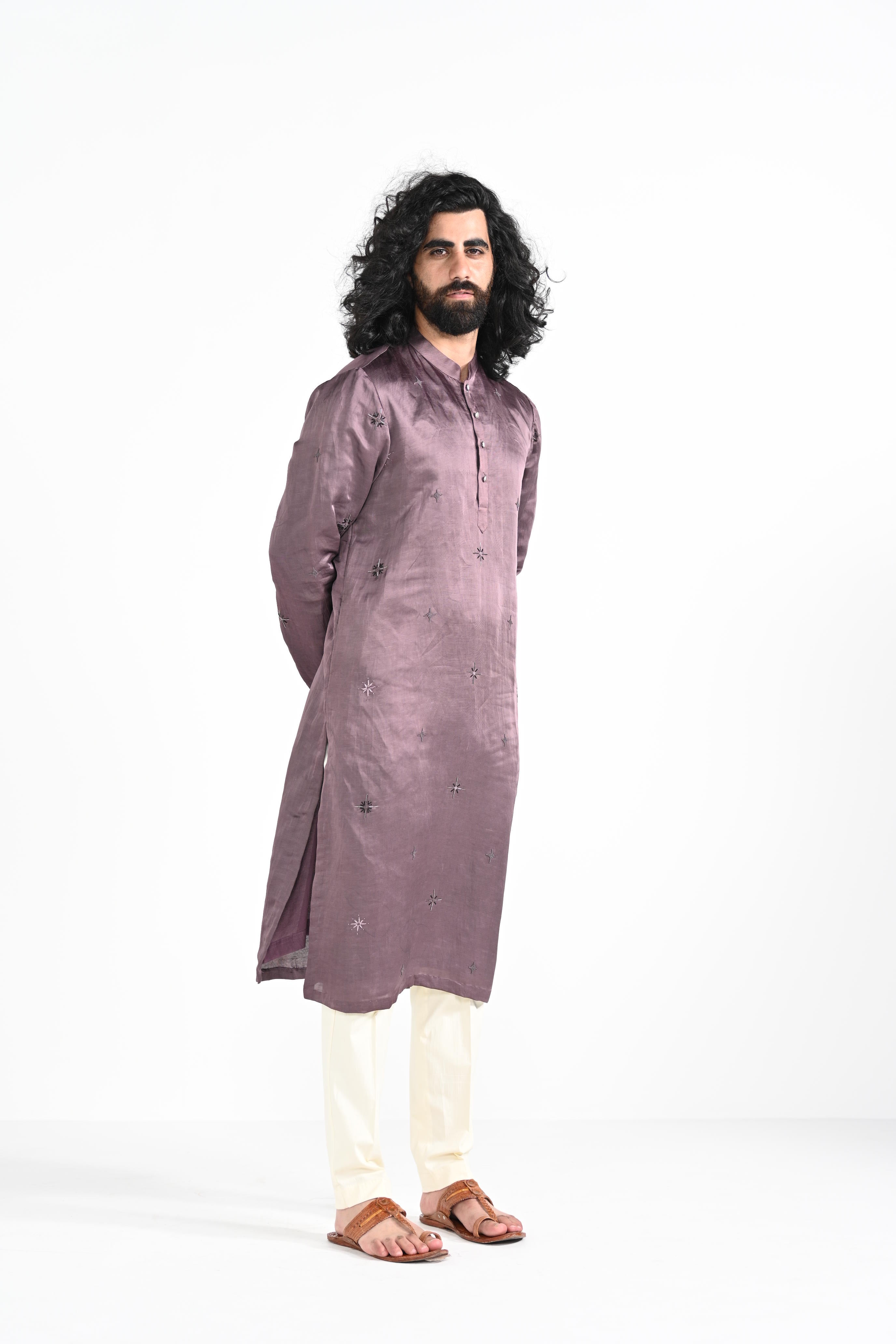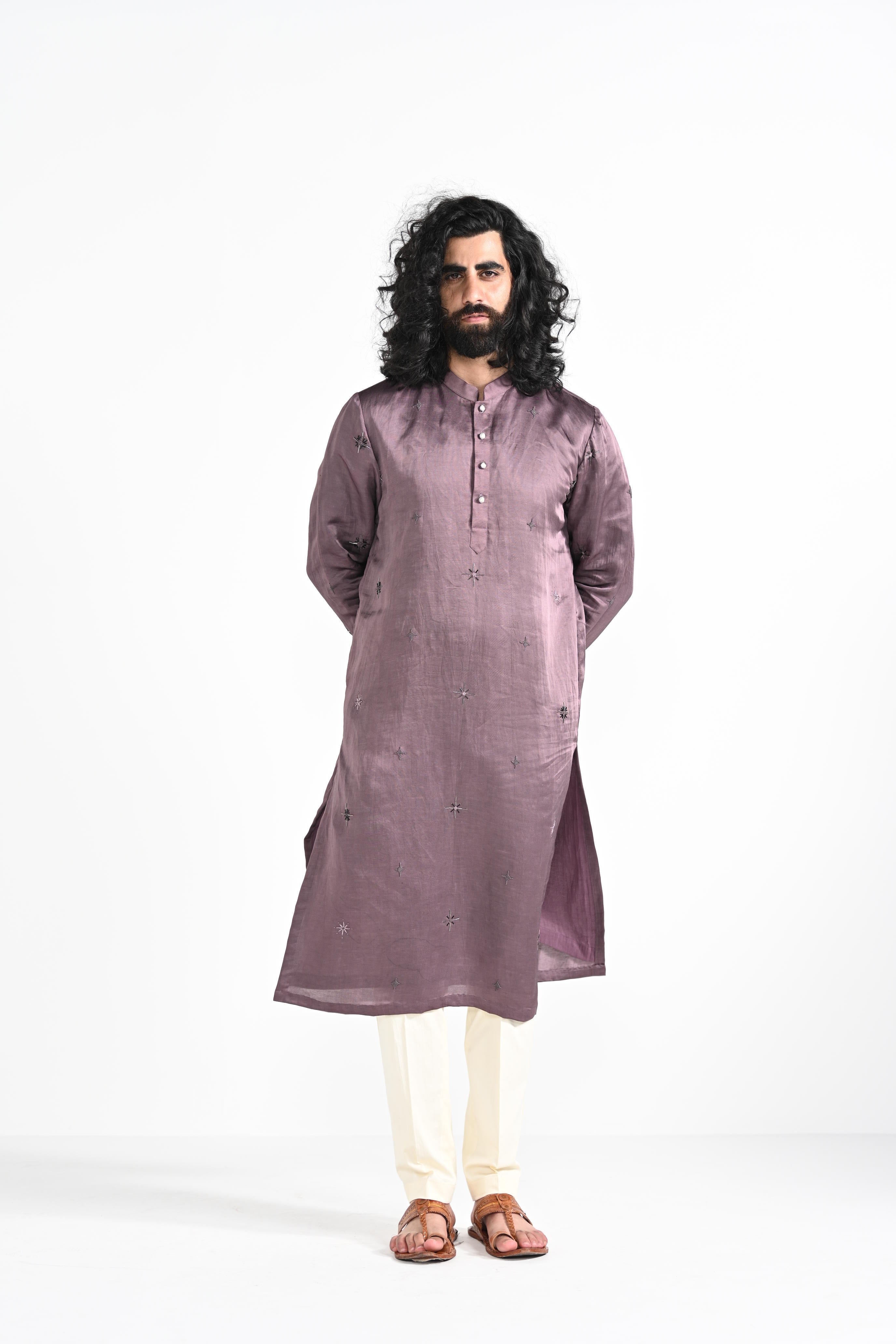 Twilight Pink thread nd pipe work hand embroidered on linen satin.Paired with Buttercream slim fit Pant Pajama. Color of the actual garment may vary due to lighting conditions during the shoot .