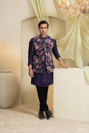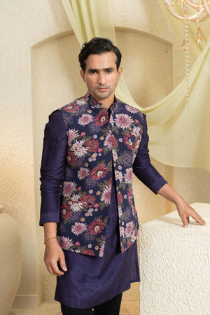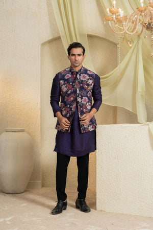 A sophisticated play of print and texture, this Bundi set features the Twilight Bloom motif brought to life with quilted stitch embroidery. Layered over a solid kurta and tapered trousers, the structured Bundi lends a refined finish, making it a distinguished choice for modern festive dressing.
